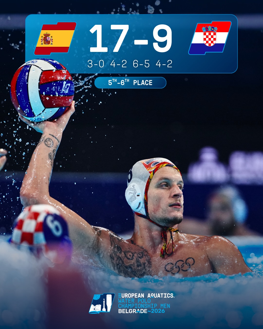 Απόψε, στο Βελιγράδι, οι δύο ομάδες μονομάχησαν για την πέμπτη θέση. Η Ισπανία ήταν και πάλι νικήτρια. Αυτή τη φορά πιο εύκολα. Το τελικό 17-9 τα λέει όλα. Οι Ίβηρες είχαν το πάνω χέρι σε όλη τη διάρκεια του αγώνα και πήραν εύκολα τη νίκη.