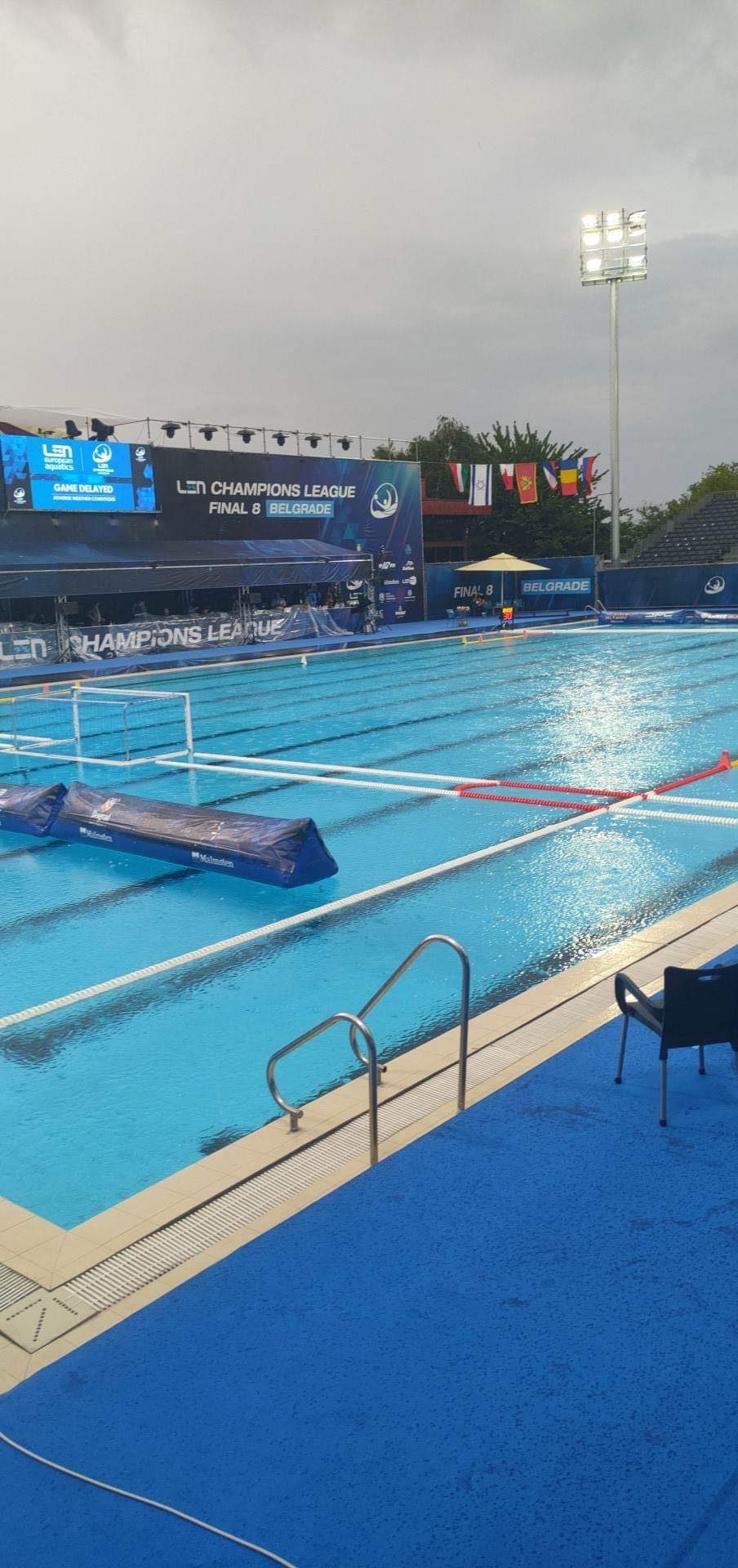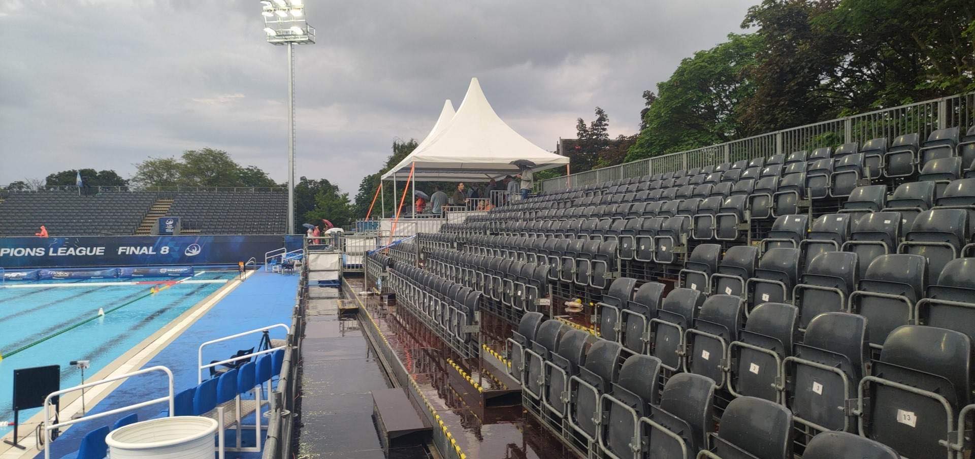 Σε φιάσκο έχει εξελιχθεί η κορυφαία Ευρωπαϊκή διοργάνωση στην υδατοσφαίριση Ανδρών, που γίνεται σε άδειες κερκίδες. Οι λιγοστοί φίλαθλοι που παρακολουθούν το ματς του ΝΟΒ με την Μπρέσια προσπαθούν να προφυλαχθούν από την καταιγίδα, όπως φαίνεται από τις φωτογραφίες παρακάτω που μας έχει στείλει ο απεσταλμένος μας Πάνος Τσολακούδης