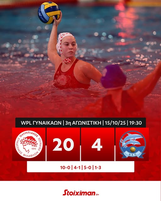 Σε τυπική διαδικασία μετέτρεψε ο Ολυμπιακός την αναμέτρηση με τη νεοφώτιστη στη μεγάλη κατηγορία ΝΕ Πατρών, αφού επιβλήθηκε με 20-4 στο πλαίσιο της 3ης αγωνιστικής για την Waterpolo League Women, το απόγευμα της Τετάρτης (15/10), στο κολυμβητήριο του Πειραιά.