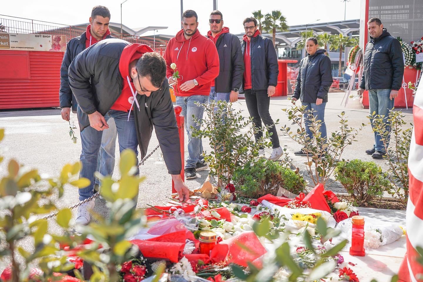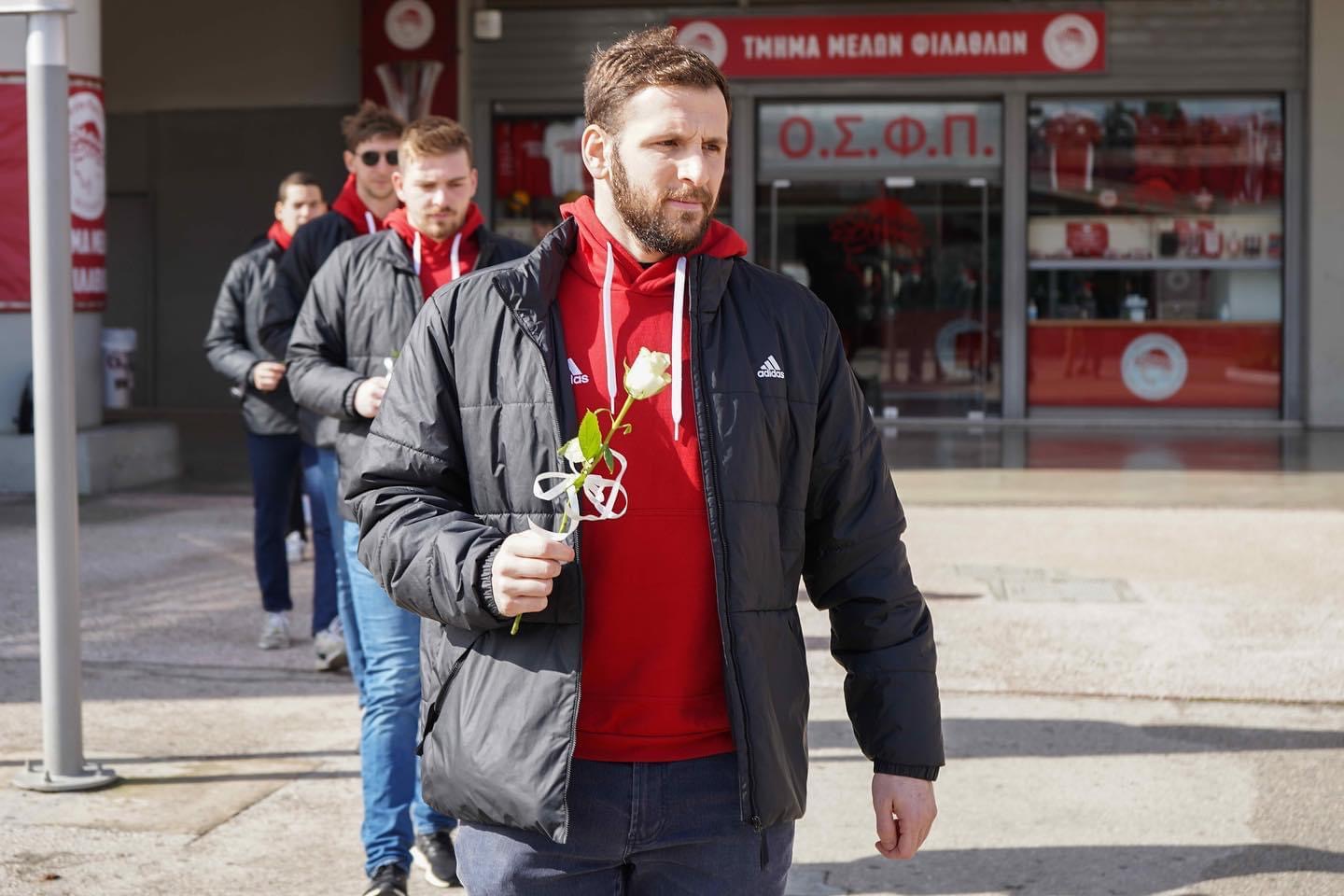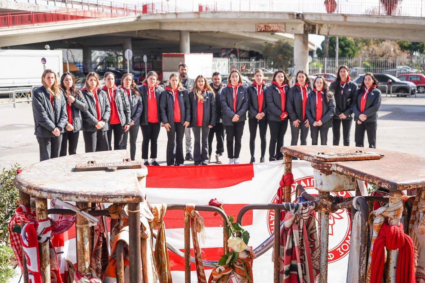 Οι αθλήτριες και οι αθλητές των τμημάτων υδατοσφαίρισης του Ολυμπιακού, συνοδευόμενοι από τους προπονητές τους, βρέθηκαν στο γήπεδο Καραϊσκάκη και άφησαν ένα λευκό τριαντάφυλλο στο μνημείο των 21 θυμάτων της θύρας 7.
