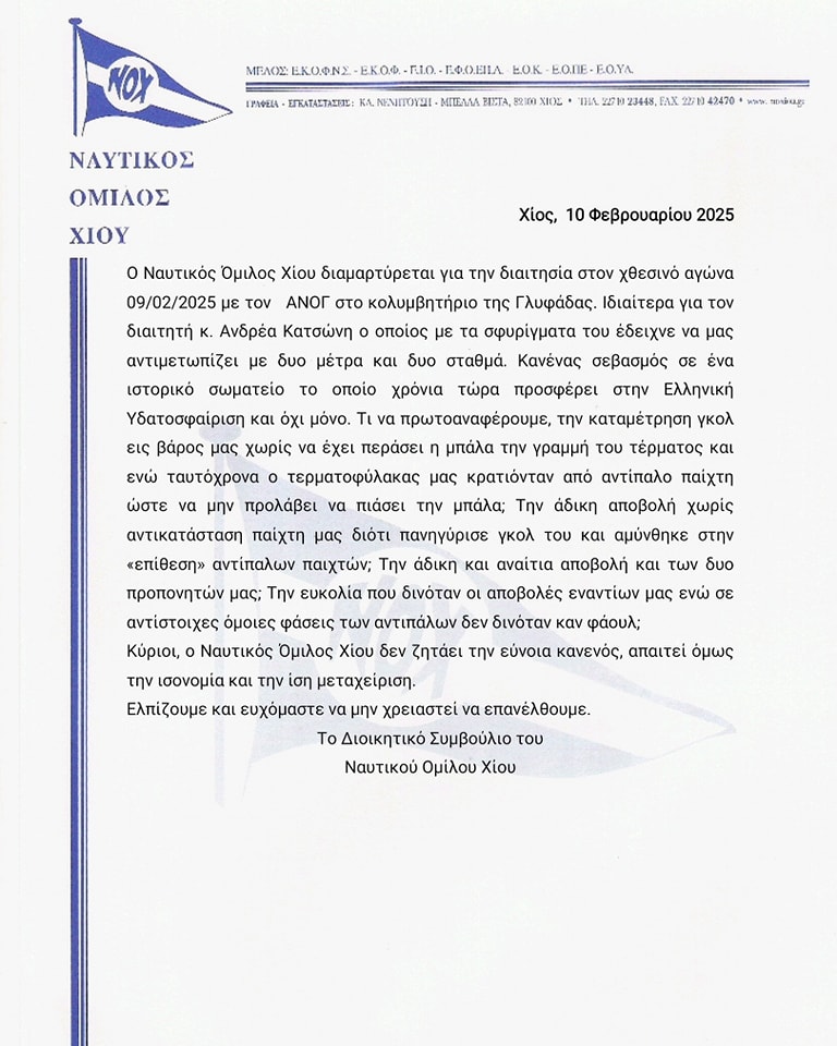 Κέρδισε αλλά έχει ενστάσεις σχετικά με τα σφυρίγματα των διαιτητών. Ο Ναυτικός Όμιλος Χίου επιβλήθηκε με 14-11 του ΑΝΟ Γλυφάδας, στο μοναδικό ματς της 14ης και τελευταίας αγωνιστικής της Α' φάσης, που πραγματοποιήθηκε την Κυριακή (9/2) και στο πλαίσιο του Β' Ομίλου, στο κολυμβητήριο "Αντ. Δημητρόπουλος" της Γλυφάδας.
