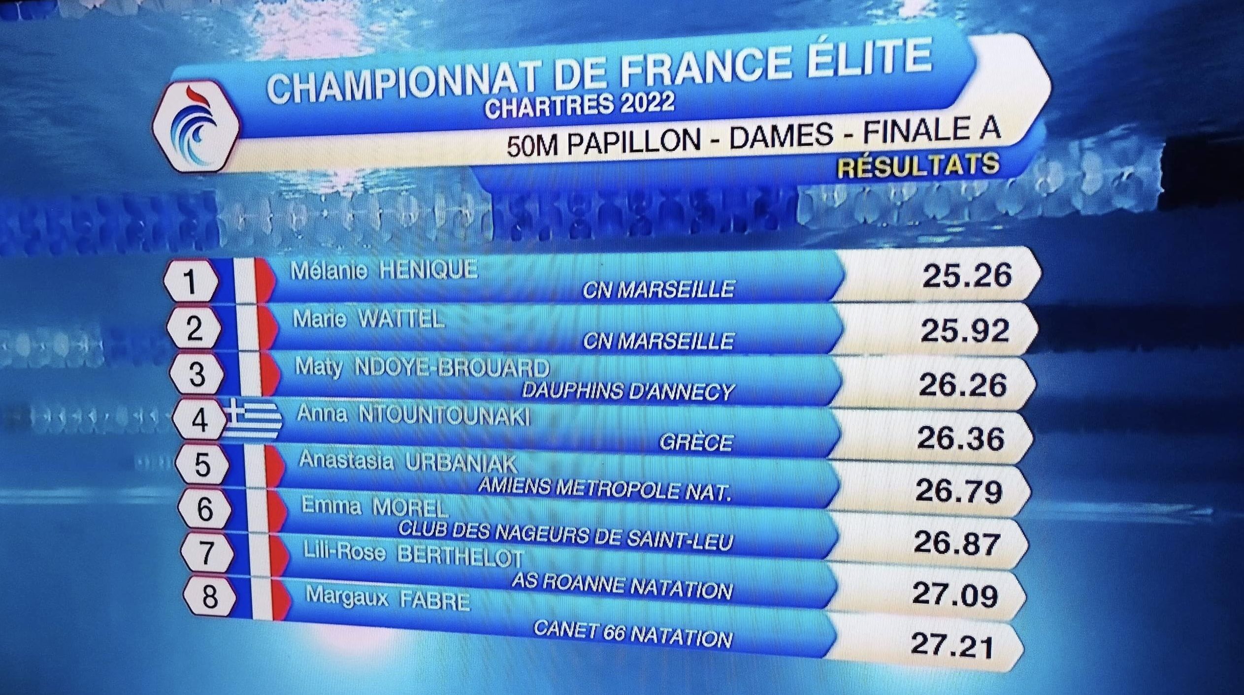 Η Άννα δεν μπόρεσε να ανέβει στο βάθρο διότι η νεαρή Ndoye Brouard με χρόνο 25.26 πήρε το χάλκινο μετάλλιο μπροστά από την κολυμβήτρια του Παναθηναϊκού 26.36. Η Άννα βρέθηκε λίγο μακριά από τα όριο 25.25 για το παγκόσμιο της Μελβούρνης.
