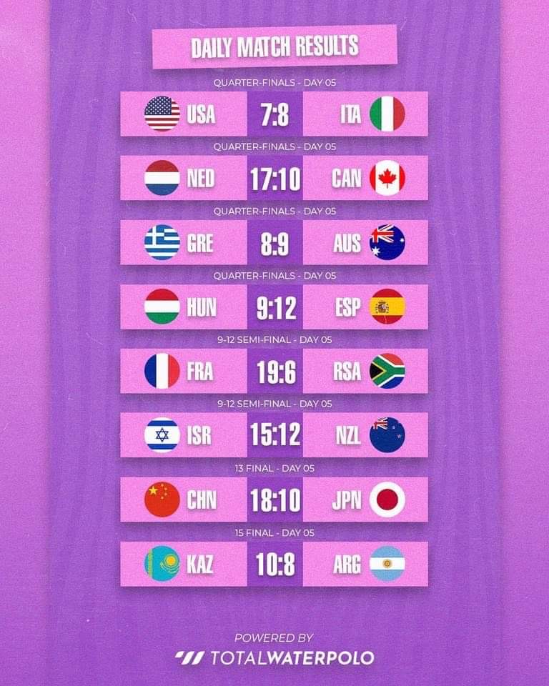 Η Ελλάδα πλέον για τις θέσεις 5-8 του παγκοσμίου πρωταθλήματος, θα παίξει με την Ουγγαρία (Τετάρτη 26/7, 09:30 ώρα Ελλάδας) που ηττήθηκε 12-9 από την Ισπανία η οποία θα βρει απεναντί της την Αυστραλία στα ημιτελικά.