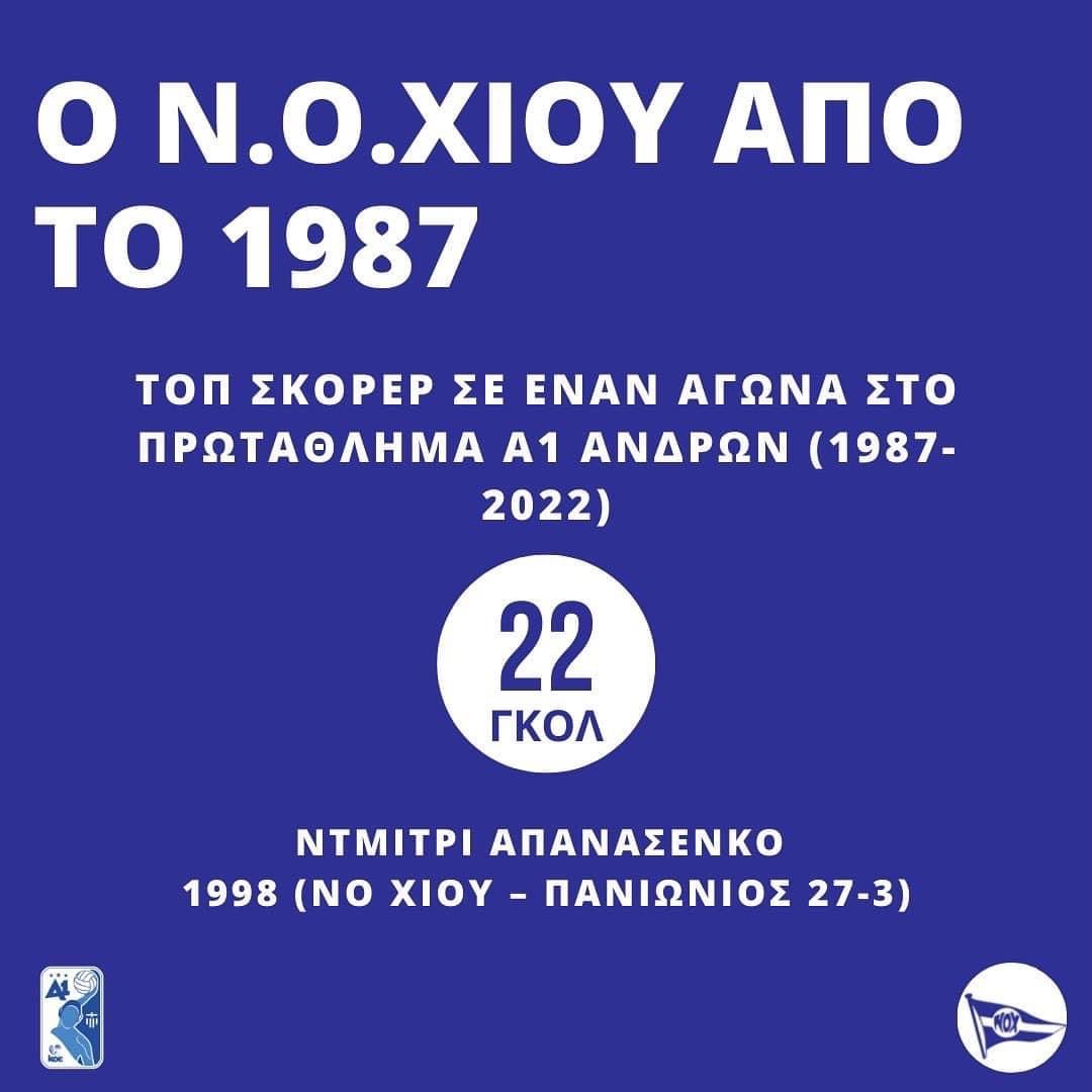 Ο ΝΟ Χίου χρησιμοποιεί στατιστικά στοιχεία για να αναδείξει την παράδοση που διατηρεί στον χώρο της υδατοσφαίρισης και να προσκαλέσει τα νέα παιδιά στην οικογένειά του. Αναδεικνύει το γεγονός ότι το τμήμα υδατοσφαίρισης ανδρών έχει 36 διαδοχικές συμμετοχές στην Α1, με 832 αγώνες και 369 νίκες, ότι ο φοβερός και τρομερός Ντιμίτρι Απανασένκο την χρονιά 1997-98 σημείωσε 156 γκολ στο πρωτάθλημα, αριθμός ρεκόρ στην ιστορία της διοργάνωσης και ότι ο ίδιος σούπερ σταρ πέτυχε 22 γκολ σε έναν αγώνα απέναντι στον Πανιώνιο όπου οι Χιώτες είχαν κερδίσει με 27-3!!!
