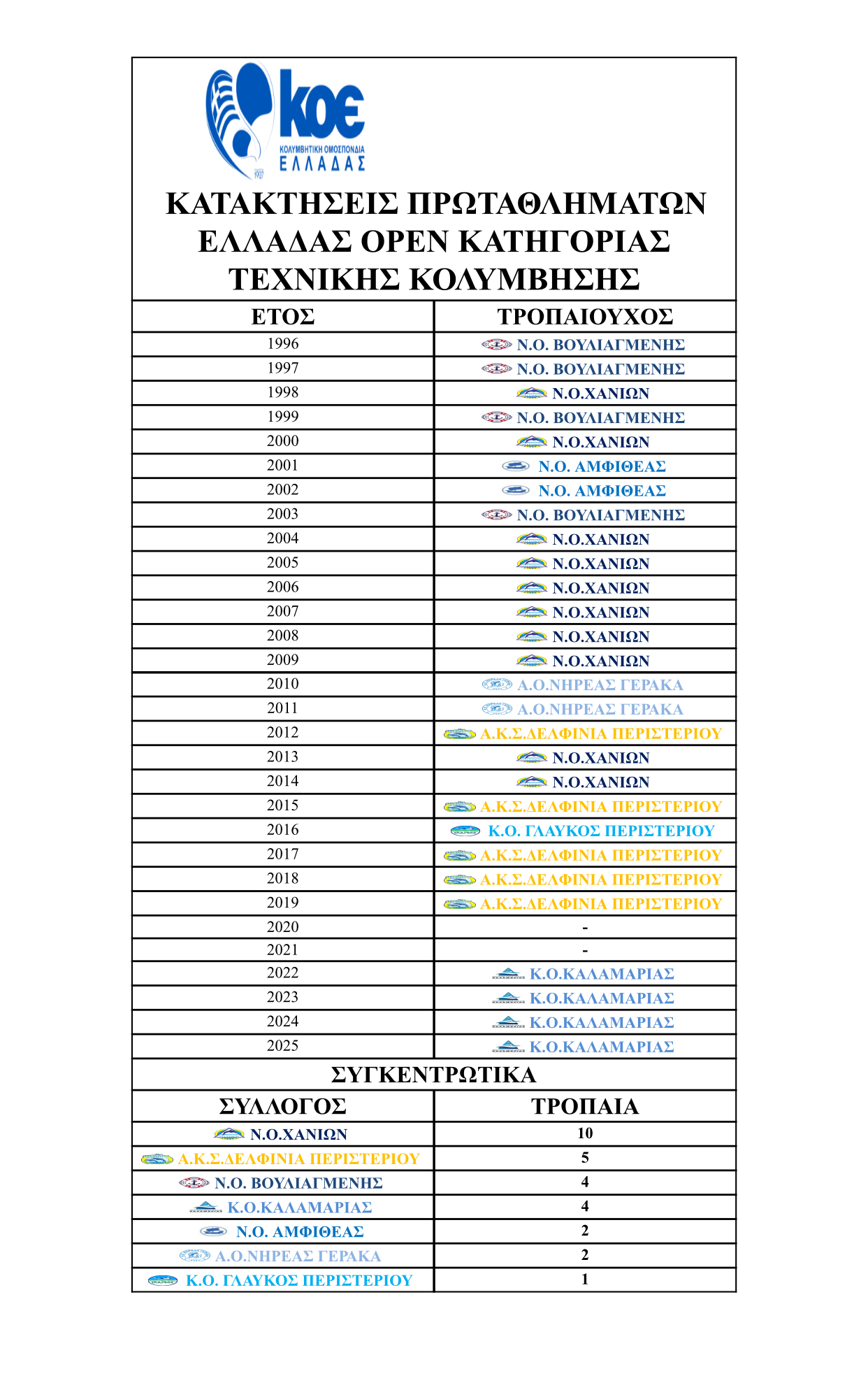 Είναι μια σημαντική παρακαταθήκη για το άθλημα της Τεχνικής Κολύμβησης αυτά τα στοιχεία καθώς δεν είχε γίνει ποτέ στο παρελθόν τέτοια καταγραφή. Αναλυτικά σας παρουσιάζουμε τα αρχεία με τους Πρωταθλητές Συλλόγους ΟΡΕΝ κατηγορίας και τους Πρωταθλητές Συλλόγους Κατηγοριών στις κάτωθι φωτογραφίες.