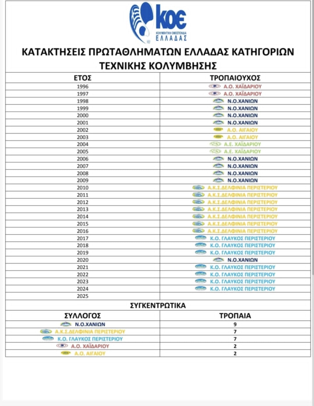 «Προσπαθούσα εδώ και ένα εξάμηνο να εντοπίσω τις πρωταθλήτριες ομάδες στα Πανελλήνια Πρωταθλήματα Τεχνικής Κολύμβησης στην ΟΡΕΝ κατηγορία και στην Κατηγοριών. Τελικά με πολύ κόπο και την μεγάλη βοήθεια των κ. Καλαμαρίδη Ηλία & Τζαμουράνη Γιώργο καταφέραμε να αποτυπώσουμε σε αρχεία τις Πρωταθλήτριες ομάδες.