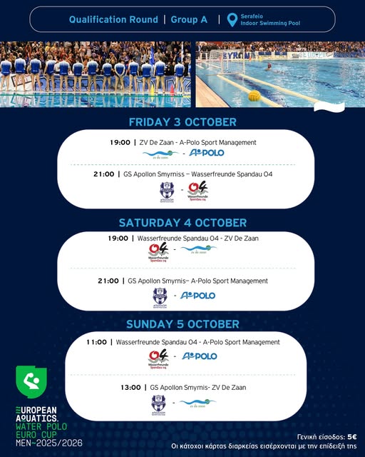 Το διάστημα 3-5 Οκτωβρίου η καρδιά του ευρωπαϊκού πόλο θα χτυπά και στην Αθήνα με τον Απόλλωνα Σμύρνης να φιλοξενεί για πρώτη φορά στην επτάχρονη παρουσία του στην Ευρώπη τον 1ο προκριματικό όμιλο του Euro Cup.