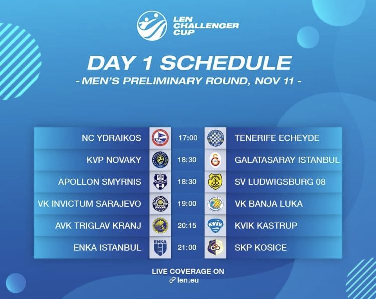 Ευρωπαϊκές υποχρεώσεις για δύο ελληνικές ομάδες. Ο Απόλλωνας Σμύρνης στο Κράνι της Σλοβενίας και ο Υδραϊκός στο Νόβακι της Σλοβακίας ξεκινούν αύριο, Παρασκευή 11 Νοέμβρη, τις υποχρεώσεις τους στην νεοσύστατη διοργάνωση του Challenger Cup.