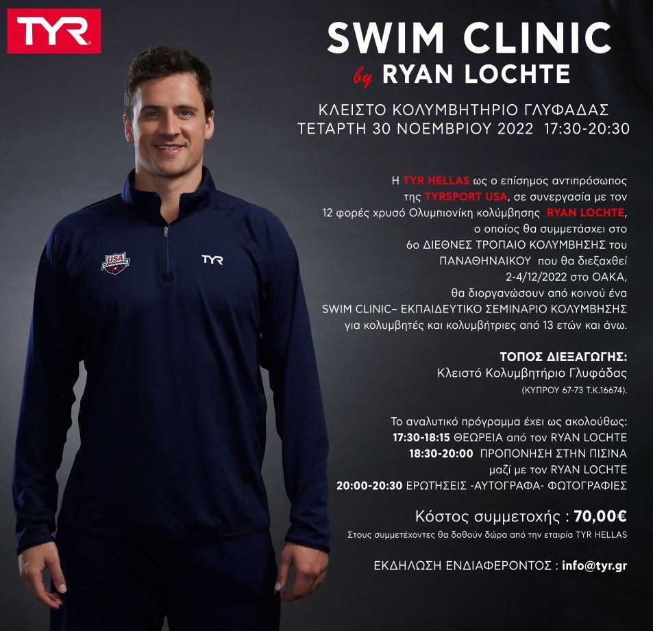 Ο Λόχτε, σε συνεργασία με την TYR θα διοργανώσει ένα εκπαιδευτικό σεμινάριο κολύμβησης στις 30 Νοεμβρίου στο κλειστό κολυμβητήριο της Γλυφάδας για κολυμβητές και κολυμβήτριες 13 ετών και άνω. Τα παιδιά θα μπορέσουν να κολυμπήσουν με τον θρύλο της αμερικανικής κολύμβησης και να μάθουν μυστικά από τον ίδιο (δείτε λεπτομέρειες στην αφίσα ή επικοινωνήστε με την εταιρία στο info@tyr.gr).