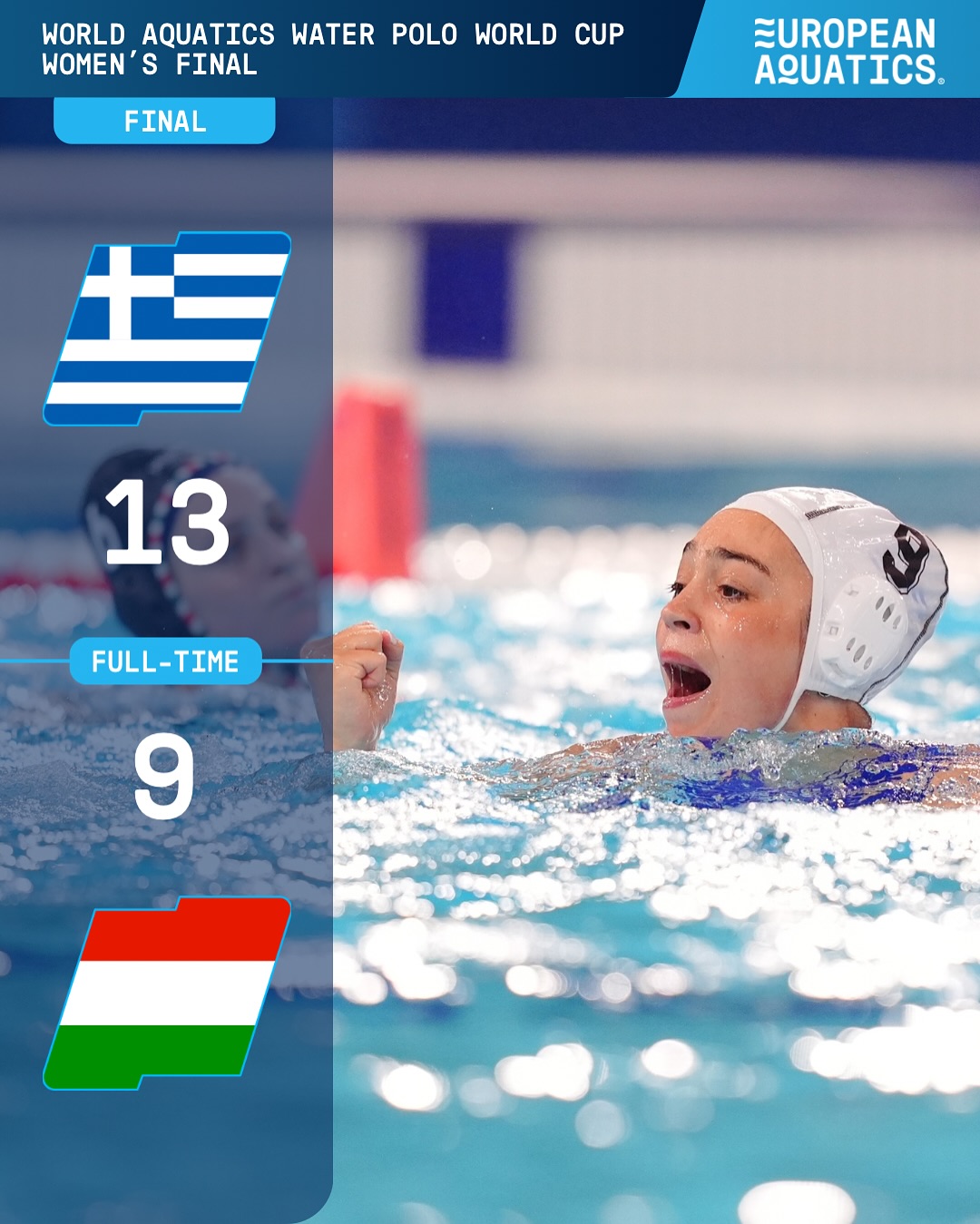 Μετά την Ιταλία και την Ολλανδία, η Ελλάδα έριξε στο καναβάτσο και την Ουγγαρία, στο «Dong’an Lake Sports Park», αφού επιβλήθηκε εύκολα με 13-9 και κατέκτησε το χρυσό μετάλλιο για πρώτη φορά στην διοργάνωση. Tο αντιπροσωπευτικό συγκρότημα κατέκτησε τον τέταρτο διεθνή τίτλο της ιστορίας του (μετά το World League του 2005, το Παγκόσμιο Πρωτάθλημα του 2011 και το Europa Cup του 2018).