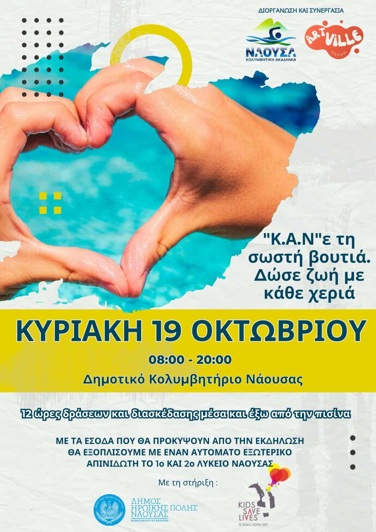 Η Κολυμβητική Ακαδημία Νάουσα (Κ.Α.Ν.) και ο πολιτιστικός σύλλογος Artville – Τεχνόπολη Νάουσας, με την αιγίδα του Δήμου Νάουσας και τη στήριξη του ανθρωπιστικού οργανισμού “Kids Save Lives – Τα Παιδιά Σώζουν Ζωές”, διοργανώνουν το 12ωρο Open Pool Event με τίτλο «Κ.Α.Ν"ε τη σωστή βουτιά – Δώσε ζωή με κάθε χεριά».