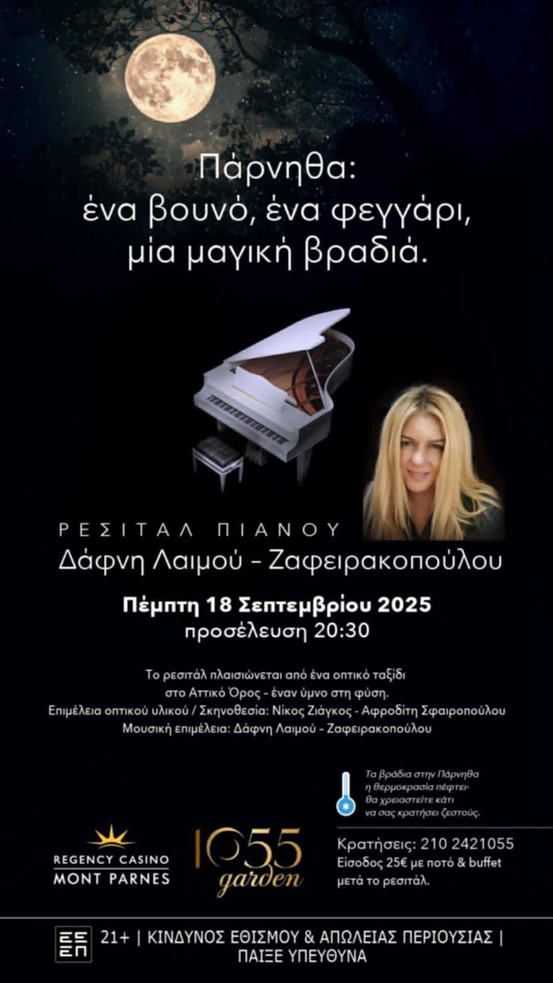 Μια ξεχωριστή βραδιά μουσικής και αισθήσεων υπόσχεται το Regency Casino Mont Parnes την Πέμπτη 18 Σεπτεμβρίου 2025, στο εστιατόριο 1055 Garden, με φόντο τη μαγευτική θέα της Αθήνας.