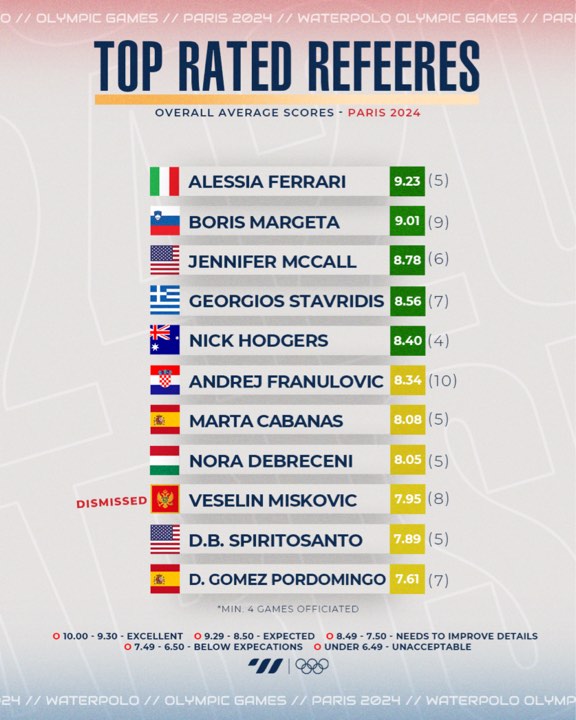Η σελίδα Total Water Polo, μία από τις κορυφαίες πηγές ενημέρωσης για το άθλημα της υδατοσφαίρισης, άσκησε αυστηρή κριτική στους διαιτητές και στις αποφάσεις τους κατά τη διάρκεια του ολυμπιακού τουρνουά στο Παρίσι. Η ιστοσελίδα επικεντρώθηκε στα πολλά και σοβαρά λάθη που σημειώθηκαν τόσο στο ανδρικό όσο και στο γυναικείο τουρνουά, ενώ έθεσε σημαντικά ερωτήματα σχετικά με την επιλογή διαιτητών για τα κρίσιμα παιχνίδια.