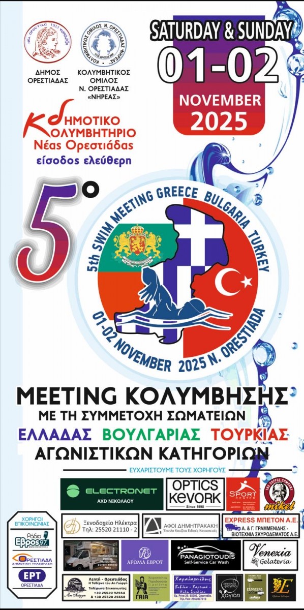 Ο Κολυμβητικός Όμιλος Νηρέας Ορεστιάδας, σε συνεργασία με τον Δήμο Ορεστιάδας και την Περιφερειακή Επιτροπή Κολύμβησης Αν. Μακεδονίας & Θράκης διοργανώνει σήμερα και αύριο (1-2/11) το 5ο Τριεθνές Κολυμβητικό Μίτινγκ.