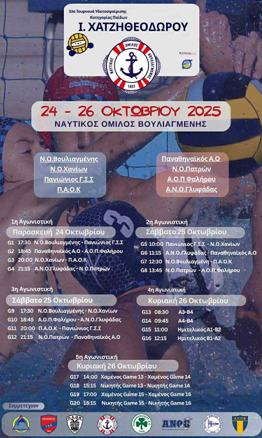 Η καρδιά της ελληνικής υδατοσφαίρισης θα χτυπήσει ξανά δυνατά στο κολυμβητήριο της Βουλιαγμένης, καθώς από 24 έως 26 Οκτωβρίου 2025 θα πραγματοποιηθεί το 33ο Τουρνουά Υδατοσφαίρισης Παίδων «Ι. Χατζηθεοδώρου», μια διοργάνωση που έχει πλέον καθιερωθεί ως θεσμός για τις μικρές ηλικίες και σημείο αναφοράς για το άθλημα στην Ελλάδα.