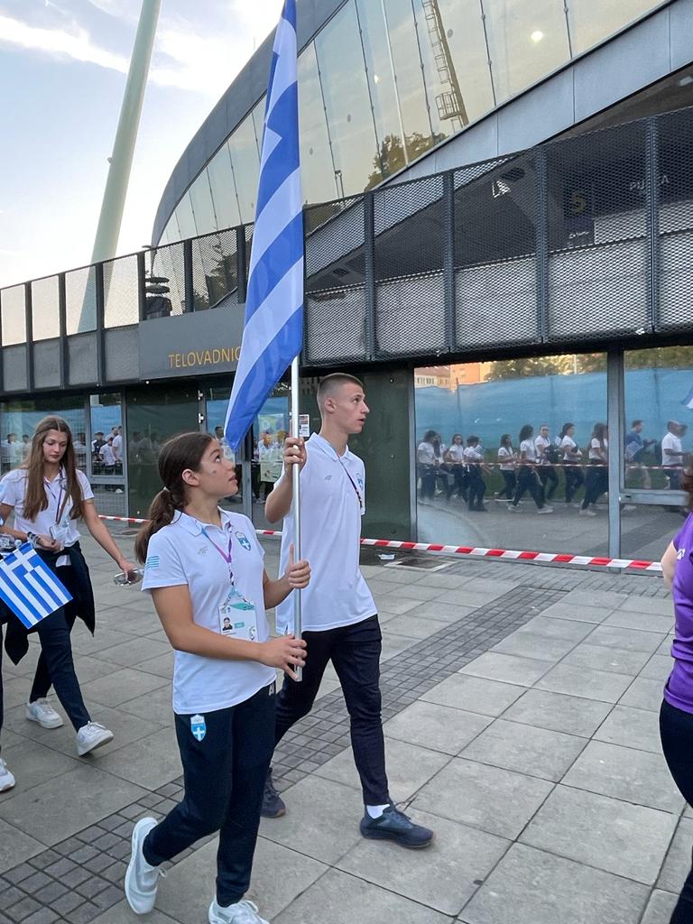 Με Σημαιοφόρους τους πρωταθλητές του στίβου και της κολύμβησης αντίστοιχα, Γιάννη Γκάρτσιο και Αντωνία Ρακοπούλου, η Ελλάδα μπήκε πρώτη στο Στάδιο του Μάριμπορ, στην Τελετή Εναρξης του Ευρωπαϊκού Ολυμπιακού Φεστιβάλ Νέων.