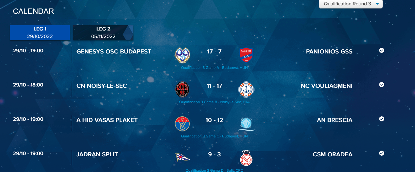 Σπουδαίο ματς ανάμεσα σε Βάσας και Μπρέσια στη Βουδαπέστη, με τελική νικήτρια τη 2η με 12-10. Οι γηπεδούχοι πέρασαν μπροστά στις αρχές της 3ης περιόδου δύο φορές, παρόλα αυτά η ιταλική ομάδα γύρισε το παιχνίδι και διεύρυνε το προβάδισμά της στην 3η περίοδο, κάνοντας πλέον το έργο της στο 2ο γύρο πιο εύκολο.