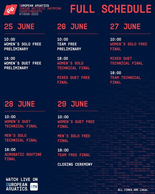 Ανοίγει την Τετάρτη 25/6 η αυλαία του Ευρωπαϊκού πρωταθλήματος Εφήβων - Νεανίδων της Καλλιτεχνικής Κολύμβησης, που θα διαρκέσει μέχρι τις 29 Ιουνίου, στο ανοιχτό κολυμβητήριο (πισίνα P10) του ΟΑΚΑ.