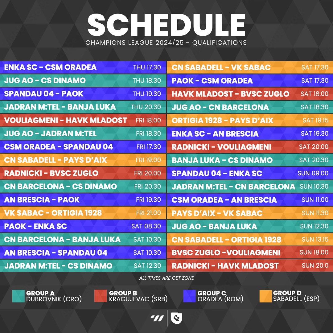 Στη μάχη των προκριματικών του Champions League των Ανδρών «πέφτουν» ο Ναυτικός Όμιλος Βουλιαγμένης την Παρασκευή (13/9) αφού βρίσκεται σε όμιλο με τρεις αντιπάλους και μια ημέρα νωρίτερα (Πέμπτη 12/9) o ΠΑΟΚ, που έχει τοποθετηθεί στο ίδιο γκρουπ με ακόμη τέσσερις ομάδες.