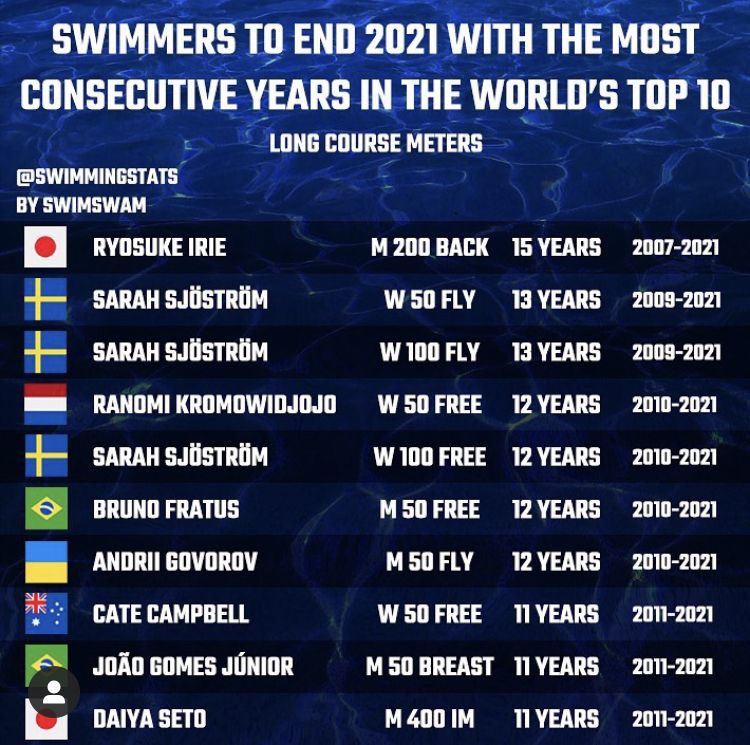 Κατά συνέπεια, πολλοί κολυμβητές μπορούν να επεκτείνουν την καριέρα τους και να συγκαταλέγονται στους ταχύτερους κολυμβητές στον κόσμο για πάνω από μια δεκαετία. Για να το καταδείξει αυτό, η σελίδα του Swimming Stats στο Instagram δημοσίευσε την λίστα με τους κολυμβητές μέχρι το τέλος του 2021 με τις περισσότερες συνεχόμενες χρονιές στο top 10 του κόσμου.