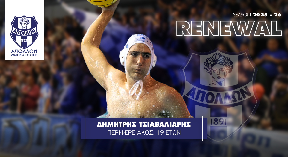 Την ανανέωση της συνεργασίας του με δύο αθλητές που ανήκουν στον πυρήνα της ομάδας υδατοσφαίρισης ανακοίνωσε ο Απόλλων Σμύρνης, ενόψει της αγωνιστικής περιόδου 2025-2026. Συγκεκριμένα, στο ρόστερ της «ελαφράς ταξιαρχίας» θα παραμείνουν και τη νέα σεζόν ο τερματοφύλακας Γιάννης Γιαννάρας και ο περιφερειακός Δημήτρης Τσιαβαλιάρης.