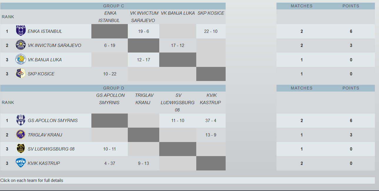 Στον Β' Όμιλο η Τεράσα έχει νικήσει κατά σειρά Άσα Τελ Αβίβ και Χετ Ράβαϊν και προκρίθηκε με 6 βαθμούς, ενώ για τον Γ' Όμιλο η Ένκα από την Τουρκία προκρίθηκε και την ακολουθούν Σαράγεβο και Κοζίτσε με 3 βαθμούς έκαστη.