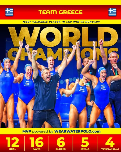 Στην κορυφή του κόσμου η Ελλάδα. Ύστερα από 14 χρόνια η Εθνική μας ομάδα Υδατοσφαίρισης Γυναικών κατέκτησε και πάλι το χρυσό μετάλλιο σε Παγκόσμιο πρωτάθλημα, αφού ξεπέρασε και το εμπόδιο της Ουγγαρίας με 12-9 στον τελικό του τουρνουά που ολοκληρώθηκε σήμερα στη Σιγκαπούρη.