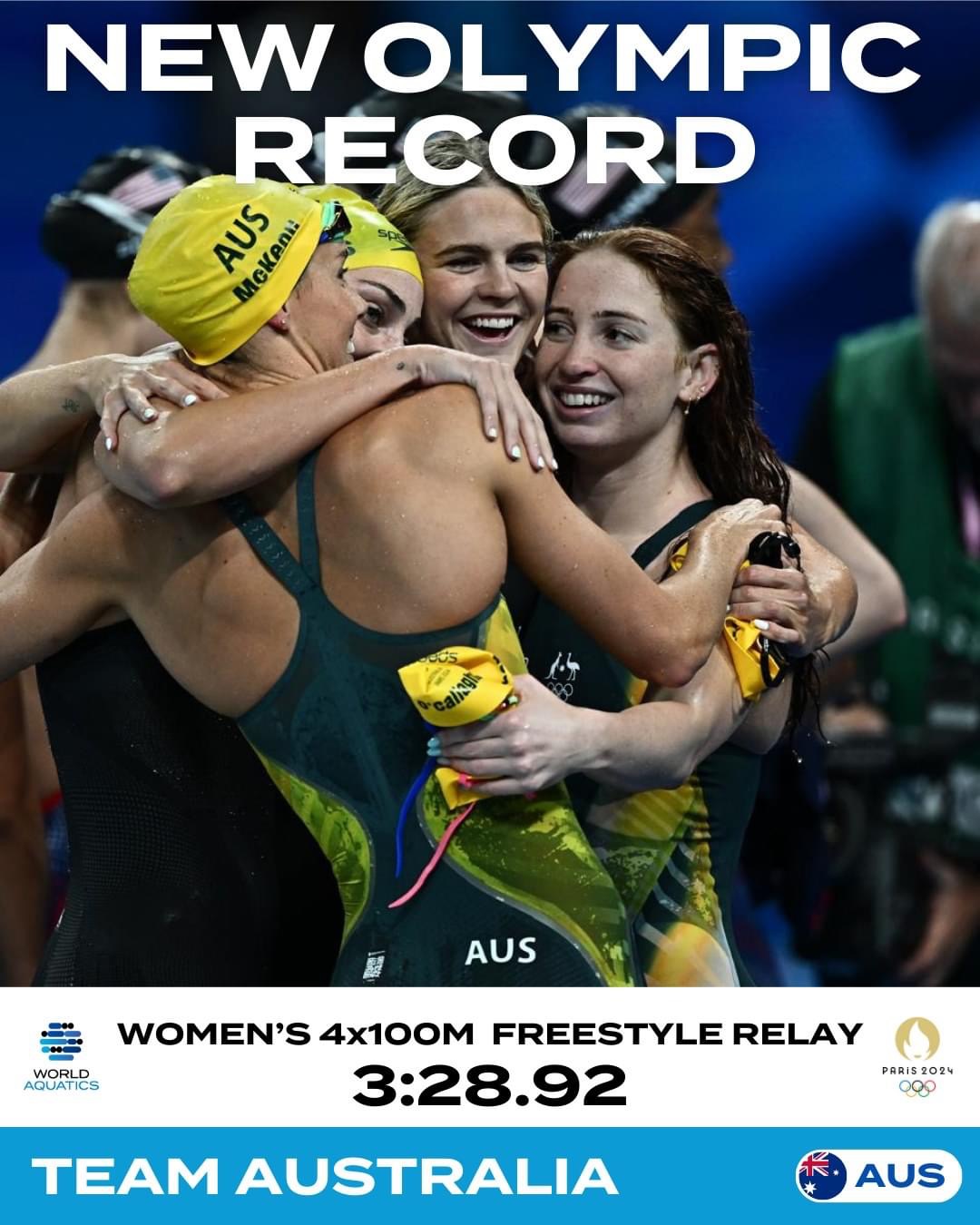 WU Qingfeng) με επίδοση 3:30.30. Το Παγκόσμιο Ρεκόρ ανήκει στην AUSTRALIA με σύνθεση O’CALLAGHAN M, JACK S, HARRIS M, MCKEOWN E και με επίδοση 3:27.96 από τις 23/7/2023. Το Παγκόσμιο Ρεκόρ στα 100 μέτρα Ελεύθερο ανήκει στην SJOSTROM SARAH (SWEDEN) με 51.71 από τις 23/7/2017. Για την McKEON Emma αυτό είναι το 11ο μετάλλιο σε Ολυμπιακούς αγώνες (5 χρυσά, 2 αργυρά, 4 χάλκινα).