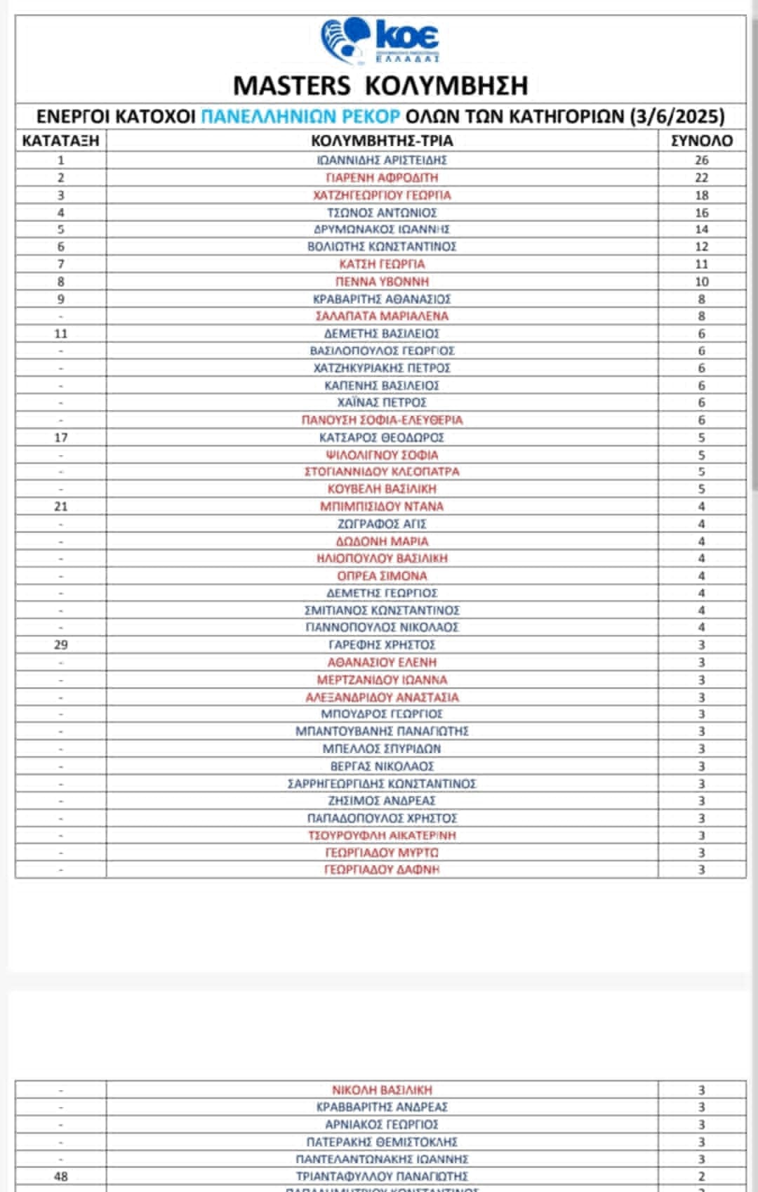 Η Κολυμβητική Ομοσπονδία Ελλάδας (Κ.Ο.Ε.) διοργανώνει το Πανελλήνιο Πρωτάθλημα Κολύμβησης Βετεράνων (MASTERS) «2025», σε συνεργασία