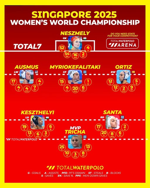 Η κορυφαία επτάδα του Total Waterpolo ολοκληρώνεται με την Kesztehli από την Ουγγαρία, την Ortiz από την Ισπανία, την Ausmus από τις ΗΠΑ και την Neszmély, τερματοφύλακα της Ουγγαρίας.