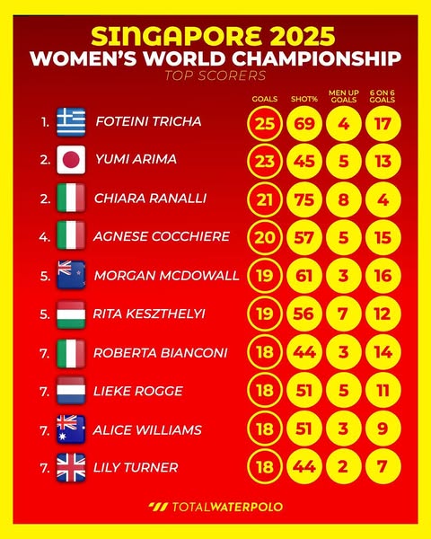 Με 25 γκολ σε 69 σουτ, η Φωτεινή Τρίχα αναδείχθηκε 1η σκόρερ της διοργάνωσης, αφήνοντας πίσω της παίκτριες παγκόσμιας κλάσης όπως η Yumi Arima (23 γκολ) και η Chiara Ranalli (21 γκολ).