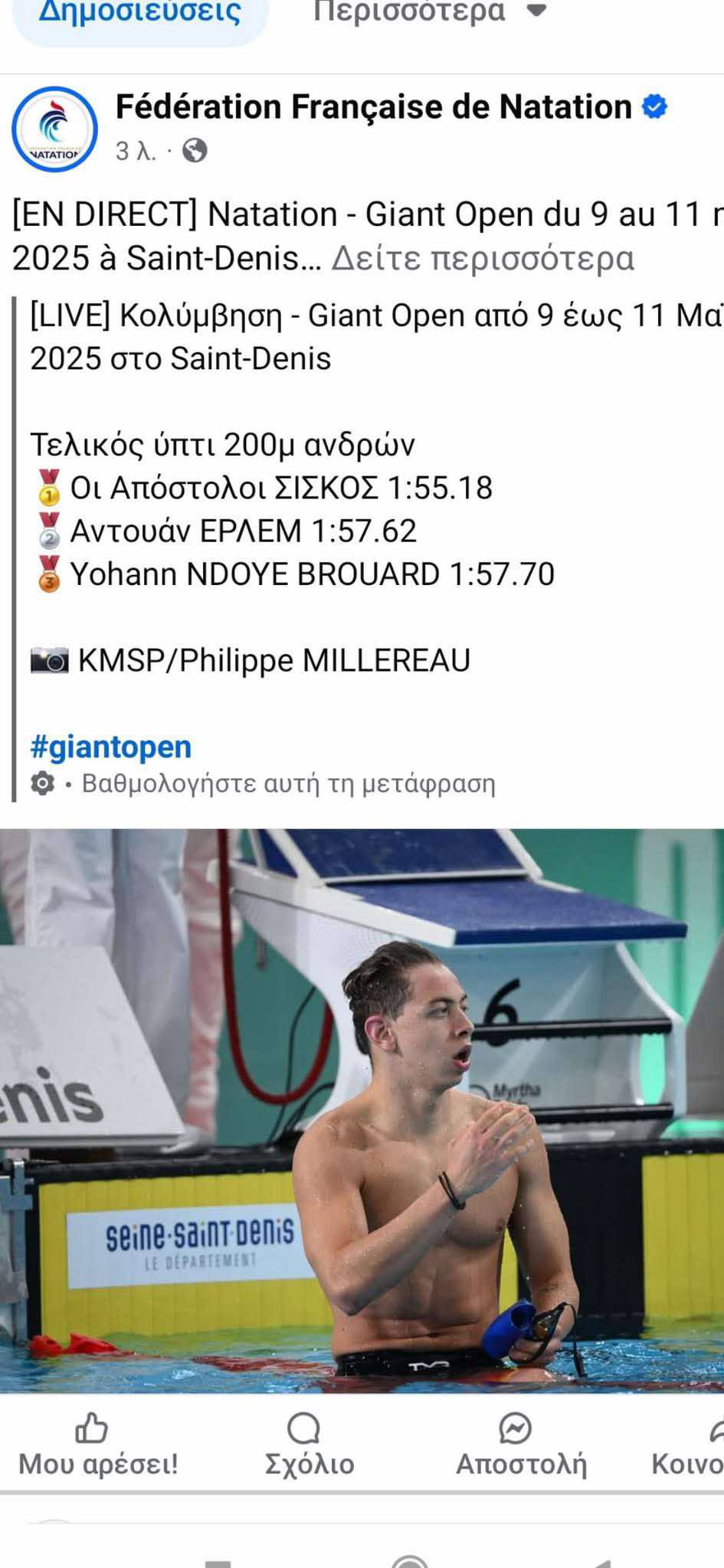 Να τονίσουμε πως η απόσταση της σημερινής επίδοσης του Τόλη από το Πανελλήνιο Ρεκόρ Ανδρών είναι μόλις 36 εκατοστά του δευτερολέπτου και να θυμίσουμε πως το ΠΑΝΕΛΛΗΝΙΟ ΡΕΚΟΡ ΑΝΔΡΩΝ ανήκει στον ΑΠΟΣΤΟΛΟ ΧΡΗΣΤΟΥ με 1:54.82 που του χάρισε τη μεγαλύτερη διάκριση στην ιστορία της Ελληνικής Κολύμβησης στην πισίνα, το ΑΡΓΥΡΟ μετάλλιο στους ΟΛΥΜΠΙΑΚΟΥΣ ΑΓΩΝΕΣ στο Παρίσι.