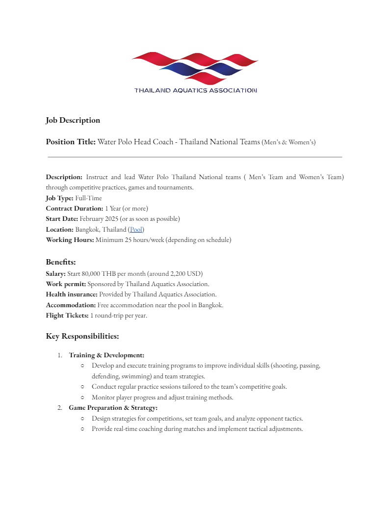 Όσοι πιστοί προσέλθετε... Η Κολυμβητική Ομοσπονδία της Ταϊλάνδης αναζητά προπονητή για τις Εθνικές της ομάδες Ανδρών και Γυναικών και μάλιστα κυκλοφόρησε σχετική προκήρυξη, την οποία ανέβασε στην επίσημη ιστοσελίδα του ο ΣΕΠΥ.