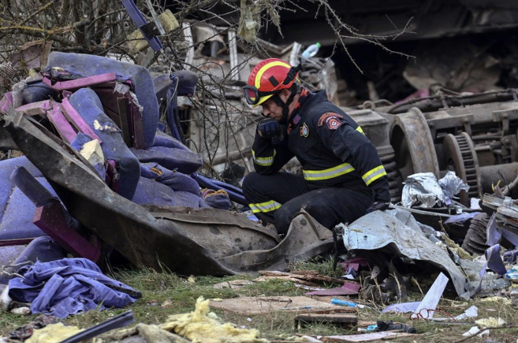 Συγγενείς περιμένουν στα σκαλιά, ενώ μεταφέρονται οι σοροί από το μοιραίο τρένο