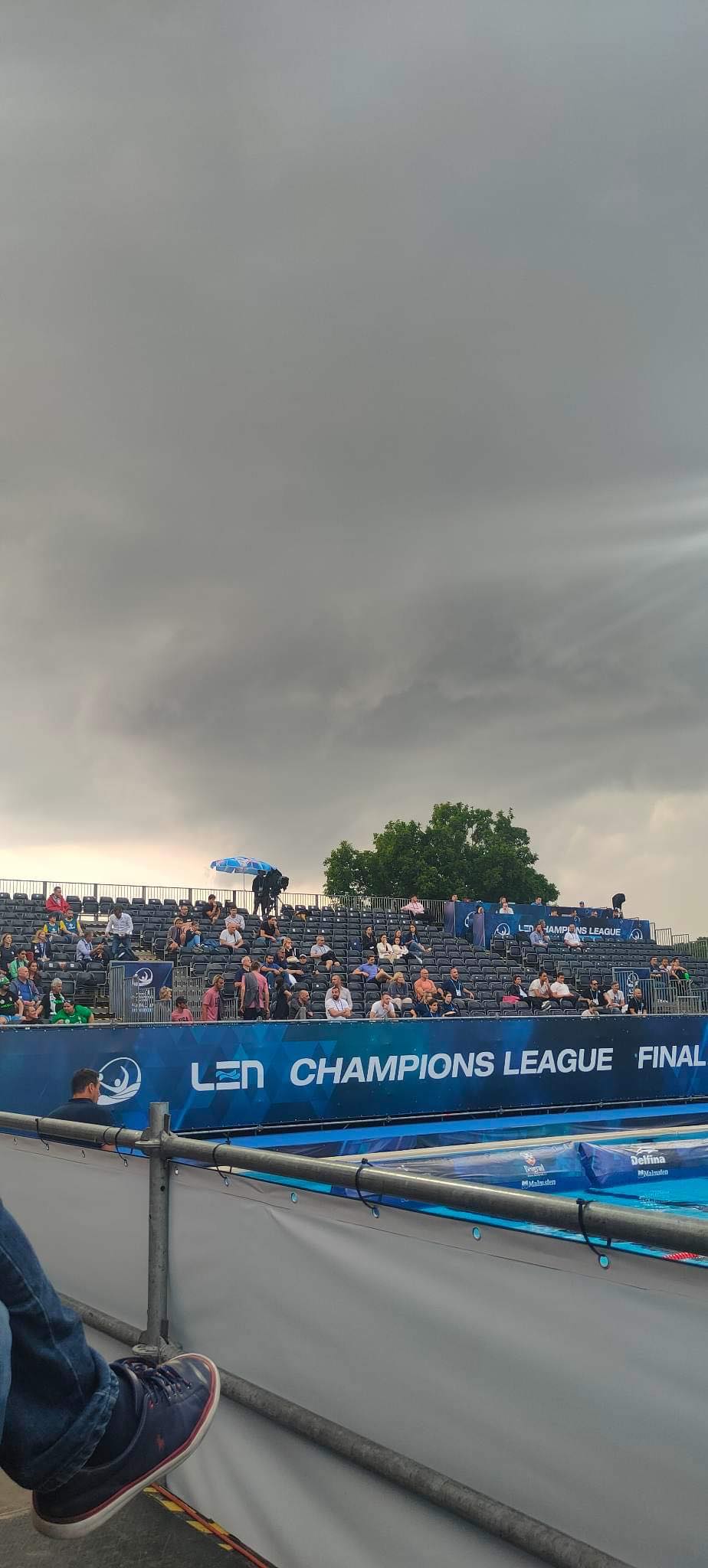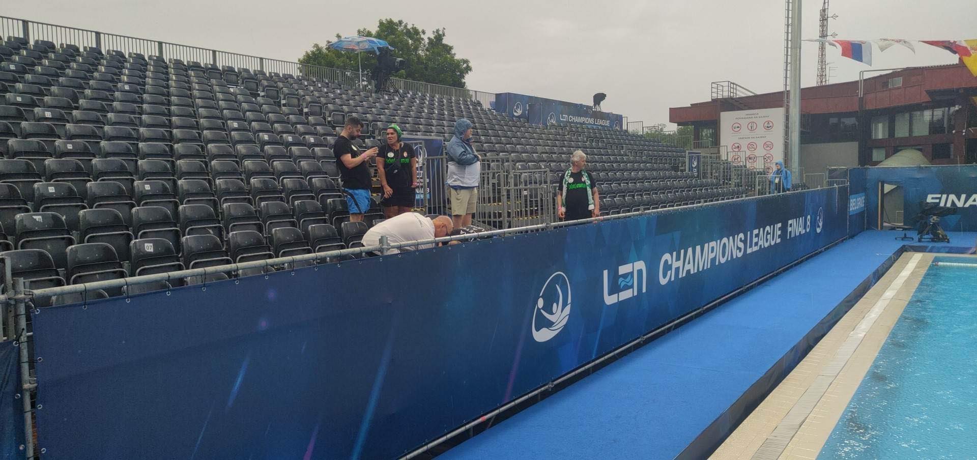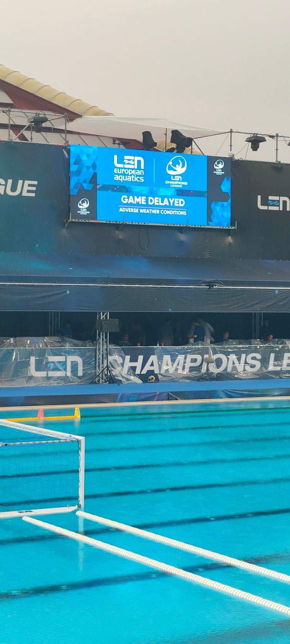 Σε φιάσκο έχει εξελιχθεί η κορυφαία Ευρωπαϊκή διοργάνωση στην υδατοσφαίριση Ανδρών, που γίνεται σε άδειες κερκίδες. Οι λιγοστοί φίλαθλοι που παρακολουθούν το ματς του ΝΟΒ με την Μπρέσια προσπαθούν να προφυλαχθούν από την καταιγίδα, όπως φαίνεται από τις φωτογραφίες παρακάτω που μας έχει στείλει ο απεσταλμένος μας Πάνος Τσολακούδης