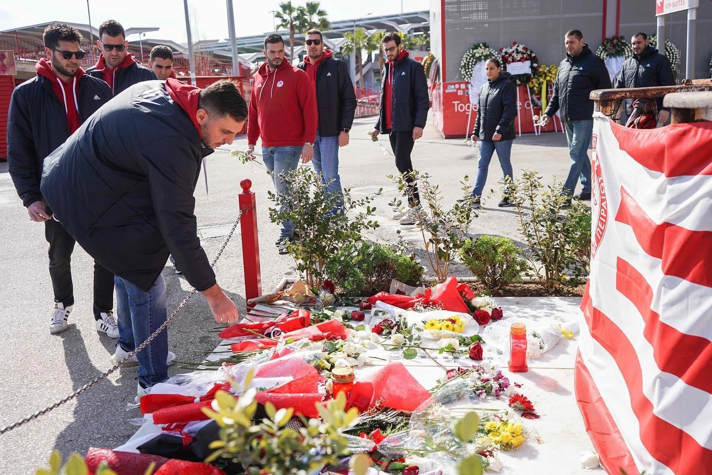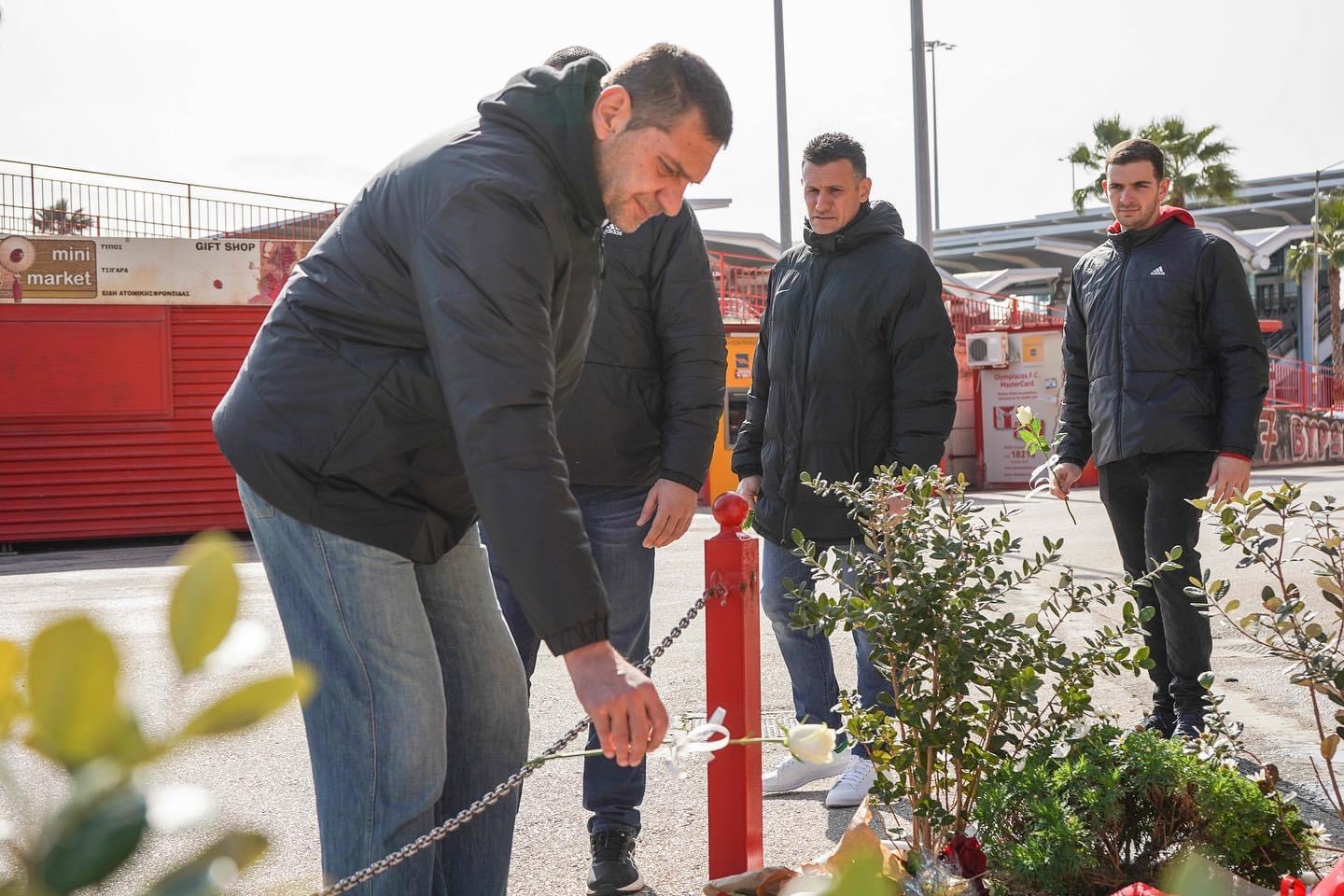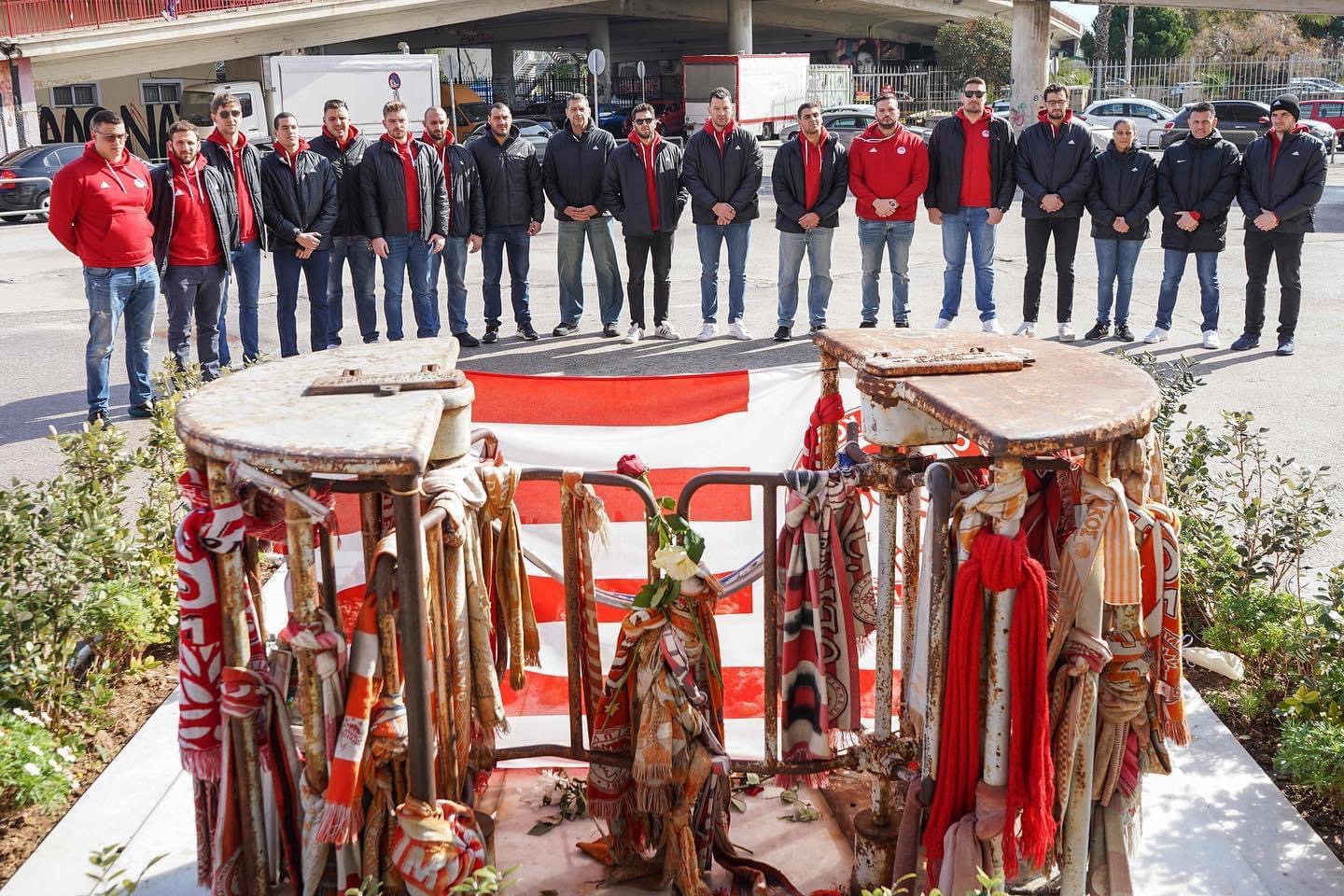 Οι αθλήτριες και οι αθλητές των τμημάτων υδατοσφαίρισης του Ολυμπιακού, συνοδευόμενοι από τους προπονητές τους, βρέθηκαν στο γήπεδο Καραϊσκάκη και άφησαν ένα λευκό τριαντάφυλλο στο μνημείο των 21 θυμάτων της θύρας 7.