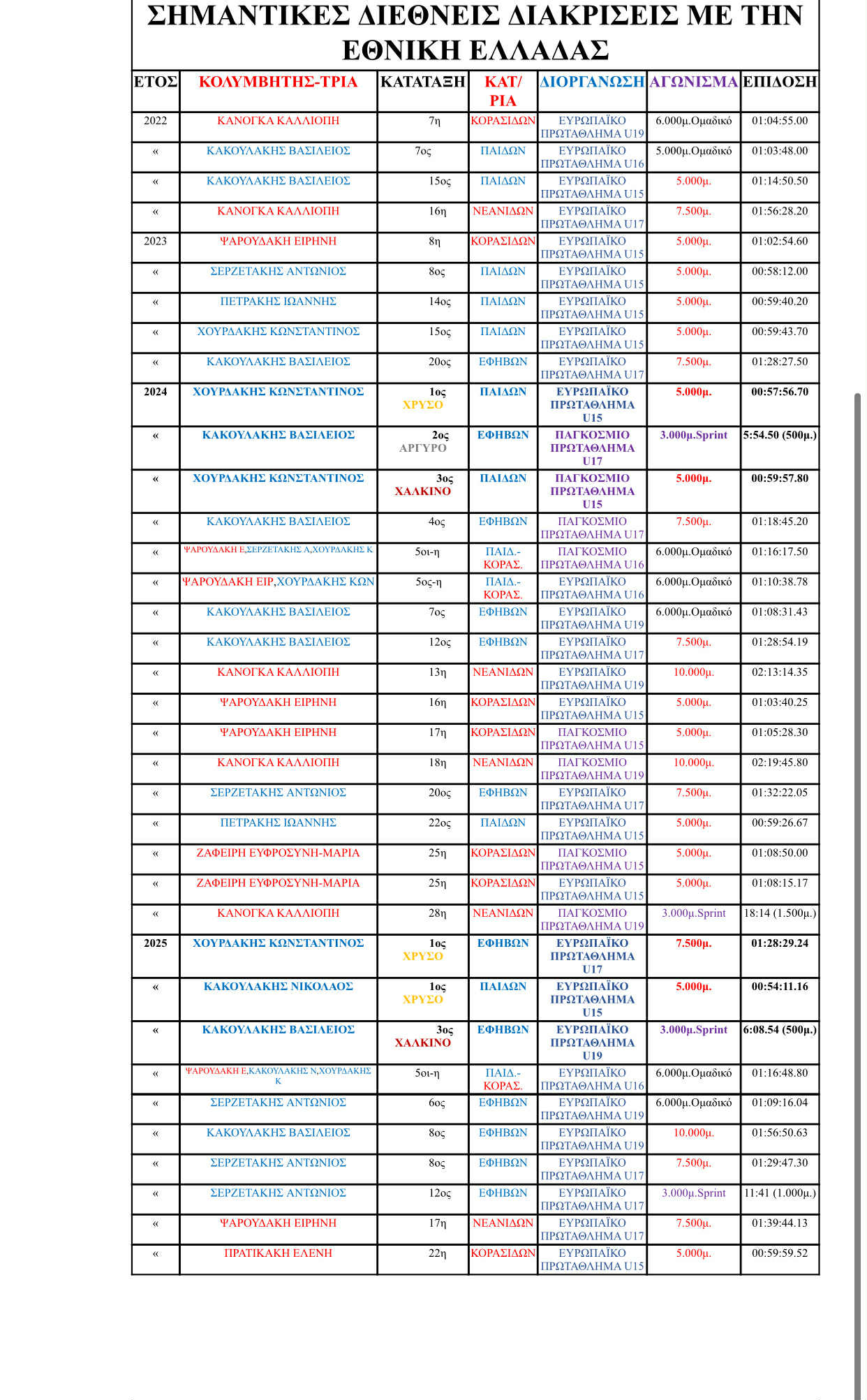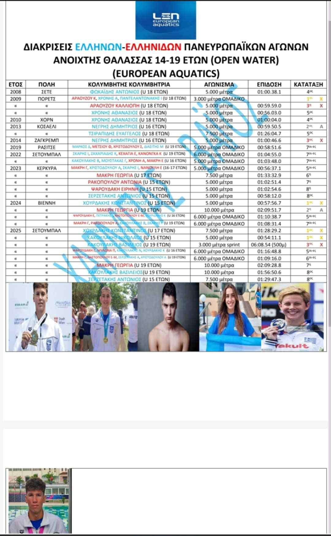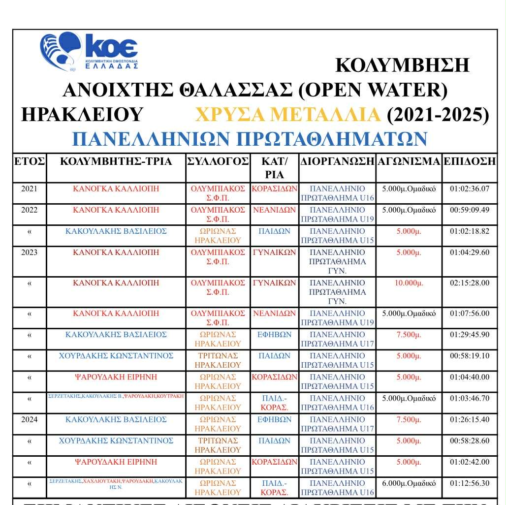 Επίσης στον παρακάτω πίνακα εδώ βλέπουμε τις ανανεωμένες διακρίσεις των Ελλήνων-νίδων στα Ευρωπαϊκά Πρωταθλήματα ΑΝΟΙΧΤΗΣ ΘΑΛΑΣΣΑΣ (OPEN WATER) JUNIOR. Η Ελληνική σκυτάλη αποτελούνταν από 3 κολυμβητές-τριες που προπονούνται στο Ηράκλειο Κρήτης με την Βασιλεία Μπακούση οι ΚΑΚΟΥΛΑΚΗΣ ΝΙΚΟΛΑΟΣ & ΨΑΡΟΥΔΑΚΗ ΕΙΡΗΝΗ και με τον Γεώργιο Σουρδή ο ΧΟΥΡΔΑΚΗΣ ΚΩΝΣΤΑΝΤΙΝΟΣ.