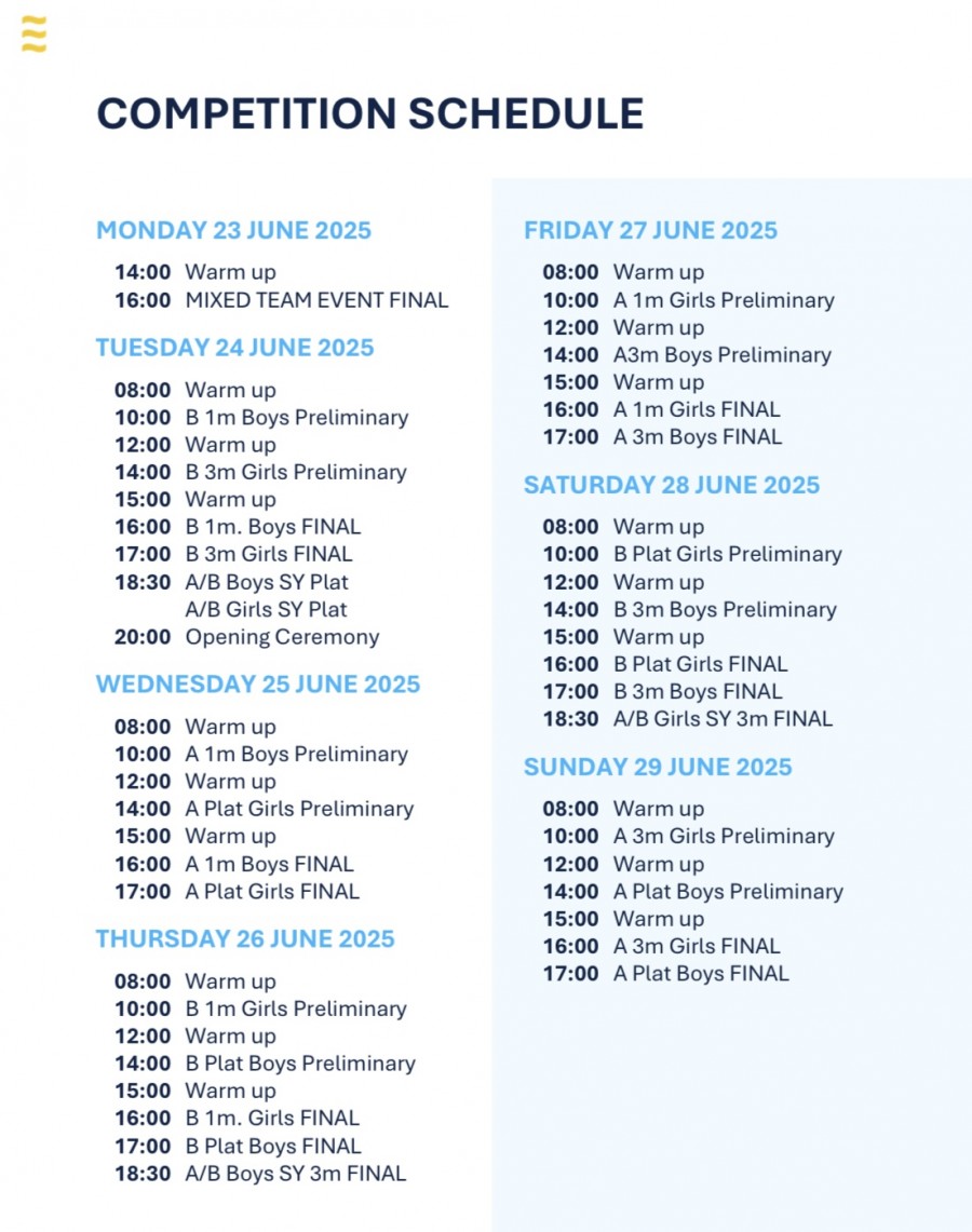 Η πρεμιέρα των αγώνων, τη Δευτέρα, περιλαμβάνει μόνο τον απευθείας τελικό στο ομαδικό αγώνισμα Mixed Team, στο οποίο μετέχουν από τέσσερις αθλητές (δύο αγόρια και δύο κορίτσια από τις κατηγορίες Α' και Β') για κάθε Εθνική ομάδα, που αγωνίζονται σε καταδύσεις ατομικές και συγχρονισμένες από 3μ. Τραμπολίνο και από σταθερό βατήρα και λαμβάνουν τη συνολική βαθμολογία που δίνει την τελική κατάταξη για κάθε χώρα.