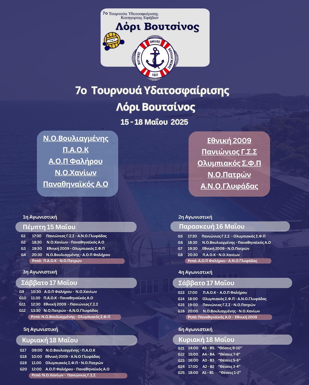 Συμμετέχουν 10 κορυφαίες ομάδες από όλη την Ελλάδα: Ν.Ο. Βουλιαγμένης, Εθνική Ομάδα U16, Ολυμπιακός, Π.Α.Ο.Κ, Α.O Παλαιού Φαλήρου, Ν.Ο. Χανίων, Πανιώνιος, Παναθηναϊκός, Ν.Ο. Πατρών και Α.Ν.Ο Γλυφάδας.