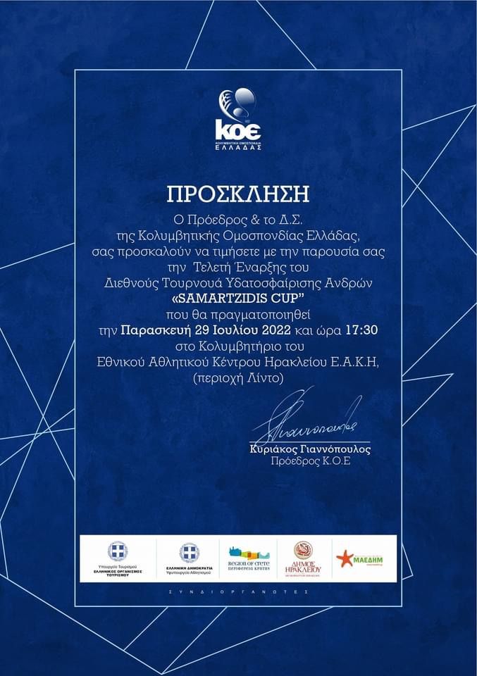 Την Παρασκευή 29/7/22 στις 17.30 θα πραγματοποιηθεί η τελετή έναρξης του Samartzidis Cup στην πισίνα του Εθνικό Αθλητικό Κέντρο Ηρακλείου.