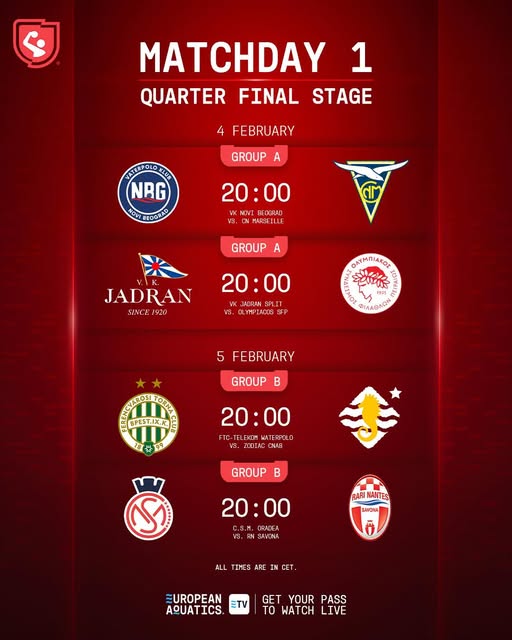 Στην πρεμιέρα του Α΄ ομίλου, την Τρίτη (4/2) η Νόβι Μπέογκραν θα υποδεχθεί τη Μαρσέιγ και ο Ολυμπιακός θα παίξει στο Σπλιτ κόντρα στην Γιαντράν. Όλα τα ματς θα ξεκινήσουν στις 21.00 κι εκείνο του πρωταθλητή Ελλάδας θα καλυφθεί από την ERTsports 2.
