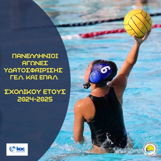 Η Διεύθυνση Φυσικής Αγωγής της Γενικής Διεύθυνσης Σπουδών Π.Ε. και Δ.Ε. του Υπουργείου Παιδείας, Θρησκευμάτων και Αθλητισμού (Υ.ΠΑΙ.Θ.Α.), σε συνεργασία με την Κολυμβητική Ομοσπονδία Ελλάδος, προκηρύσσει τους Πανελλήνιους Αγώνες Υδατοσφαίρισης μαθητών και μαθητριών Γενικών και Επαγγελματικών Λυκείων (ΓΕ.Λ. και ΕΠΑ.Λ.) Ελλάδας, σχολικού έτους 2024-2025.