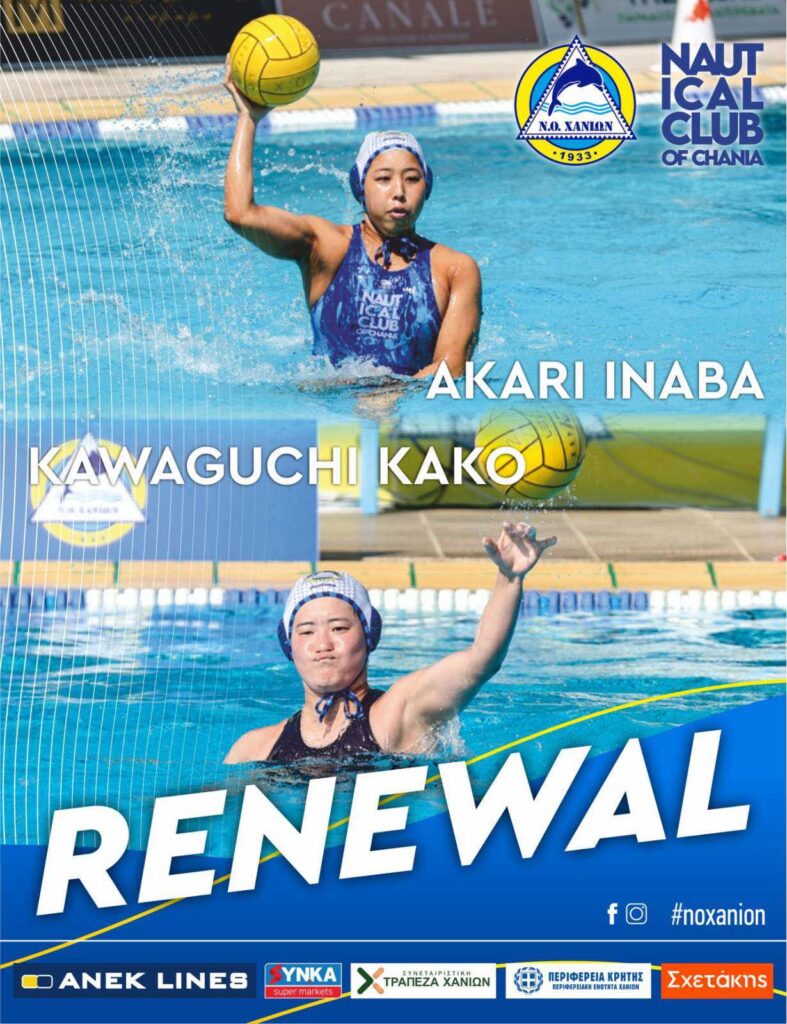 O Ναυτικός Όμιλος Χανίων ανακοίνωσε την ανανέωση της συνεργασίας του με τις Ιάπωνες αθλήτριες, Κάκο Καβακούτσι και Ακάρι Ινάμπα. Οι δύο παίκτριες, που ξεχώρισαν την περασμένη χρονιά στην Α1, θα συνεχίσουν να ενισχύουν την γυναικεία ομάδα πόλο του Ομίλου, με στόχο μια ακόμα πιο επιτυχημένη σεζόν.