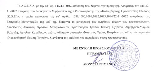 Δεκτή η προσφυγή των κηδεμόνων των ανήλικων αθλητών από την Πάτρα, για την μεταγραφή τους από το Ναυτικό Όμιλο Πατρών στην Ναυταθλητική Ένωση Πατρών.