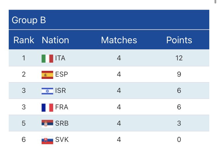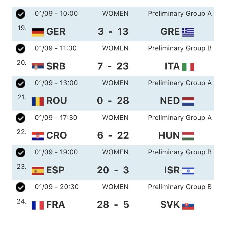 Για τον Β' Όμιλο, η Ιταλία συνέχισε το απόλυτο των νικών, επικρατώντας άκοπα της Σερβίας με 23-7, ενώ η Ισπανία δεν άφησε κανένα περιθώριο στο Ισραήλ, σκορπίζοντας το με σκορ 20-3.
