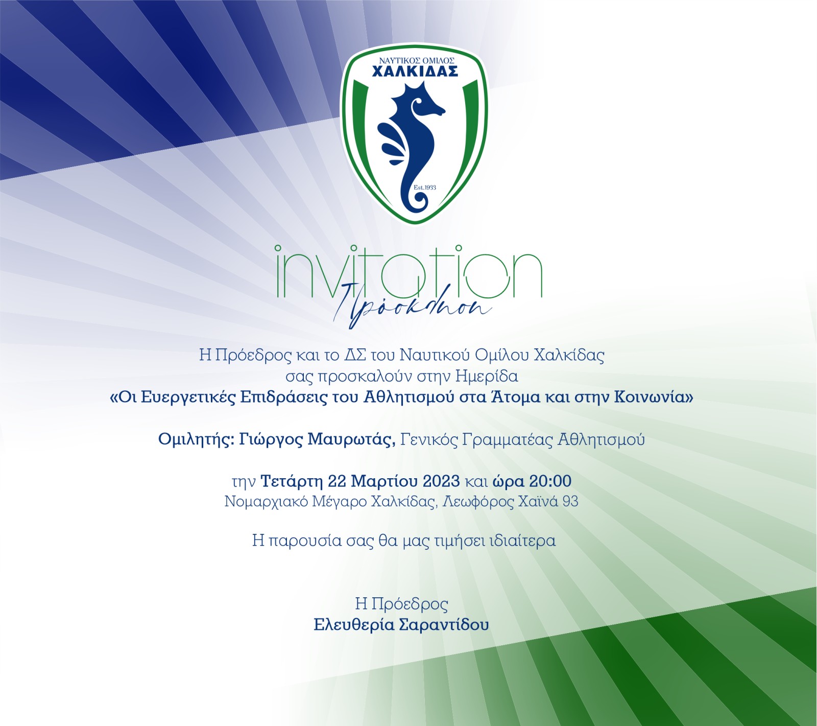 Ο Ναυτικός 'Ομιλος Χαλκίδος διοργανώνει Ημερίδα με θέμα η επίδραση του αθλητισμού στα άτομα και στην κοινωνία με ομιλητή τον Γενικό Γραμματέα Αθλητισμού κο Γιώργο Μαυρωτά την Τετάρτη 22/2 και ώρα 20.00 στο Συνεδριακό Κέντρο του Νομαρχιακού Μεγάρου