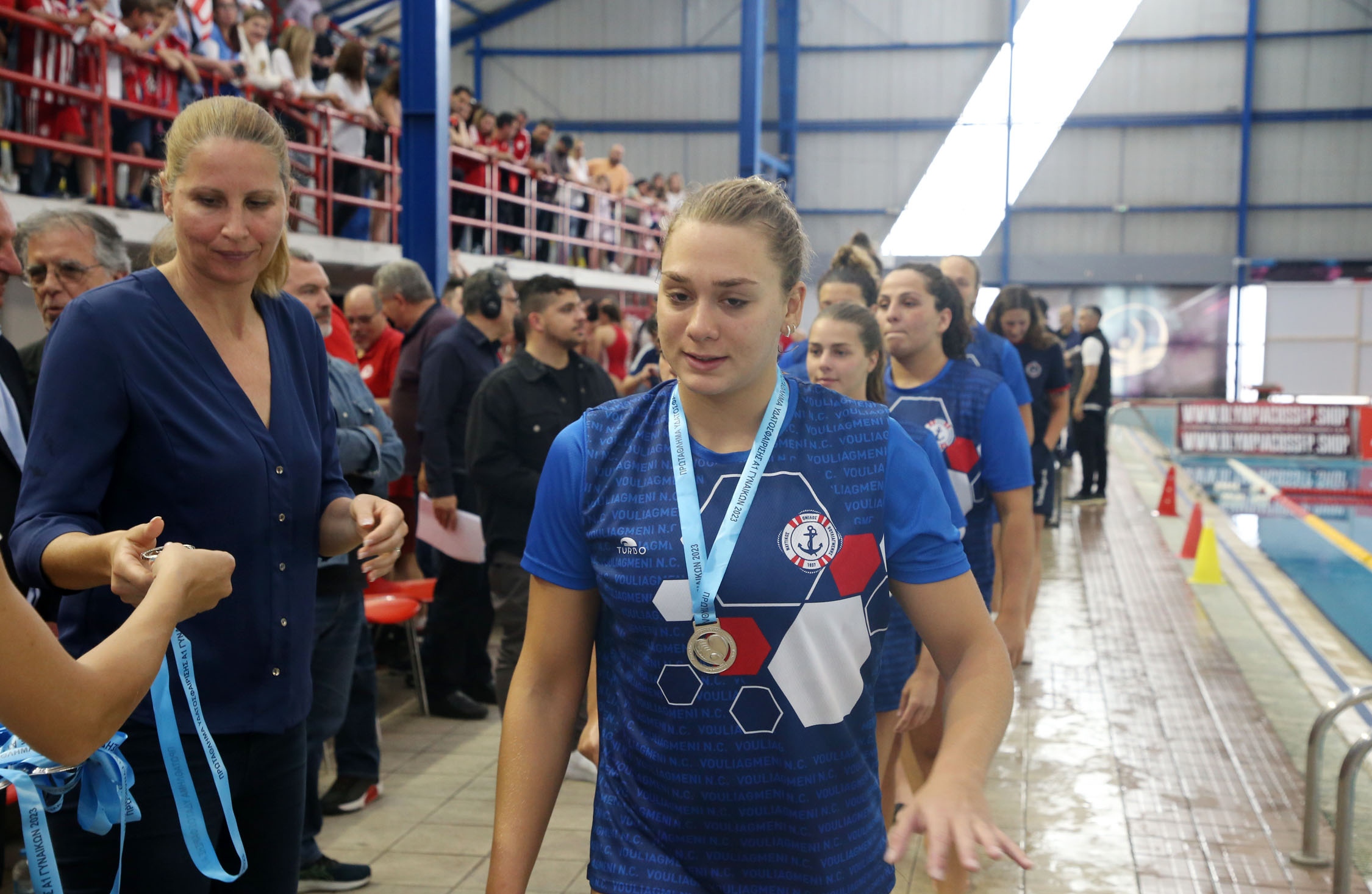 Τα μετάλλια στα κορίτσια του ΝΟ Βουλιαγμένης απένειμε το μέλος του Δ.Σ. και έφορος της γυναικείας υδατοσφαίρισης, Εύη Μωραϊτίδου.