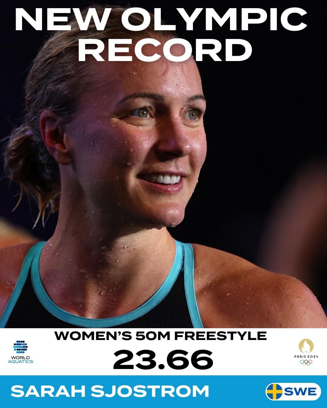 Στον ημιτελικό των 50 μέτρων ελεύθερο Γυναικών η SJOESTROEM Sarah (Sweden) σημείωσε την καλύτερη επίδοση με 23.66 που αποτελεί νέο Ολυμπιακό Ρεκόρ και μόλις 5 εκατοστά του δευτερολέπτου μακριά από το δικό της Παγκόσμιο Ρεκόρ που είναι 23.61 από τις 29/7/2023.