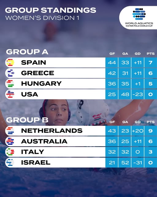 Στον τελευταίο αγώνα της ημέρας, η Αυστραλία νίκησε την Ιταλία με 12-8, εξασφαλίζοντας τη συμμετοχή της στο τουρνουά για τις θέσεις 1-4. Μαζί με την Αυστραλία, στον ίδιο όμιλο θα βρεθούν η Ολλανδία, η Ισπανία και η Ελλάδα. Η Ιταλία, από την άλλη, θα αγωνιστεί στον όμιλο για τις θέσεις 5-8, όπου οι δύο πρώτες ομάδες θα προκριθούν στην τελική φάση του Παγκοσμίου Πρωταθλήματος. Σε αυτό το γκρουπ συμμετέχουν επίσης η Ουγγαρία, οι Ηνωμένες Πολιτείες και το Ισραήλ.