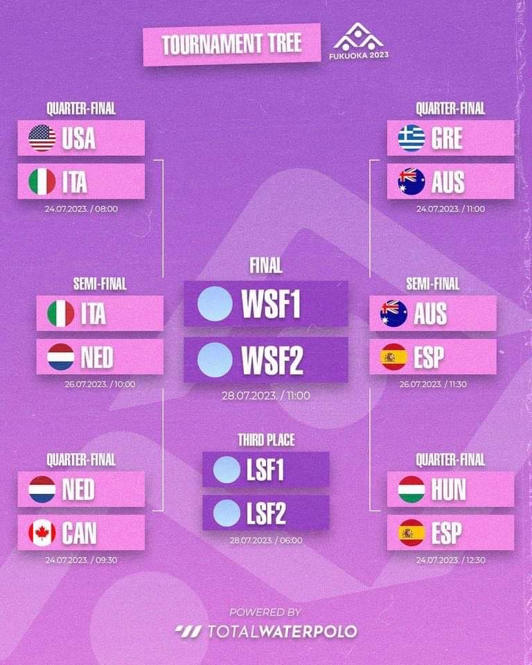Η Ελλάδα πλέον για τις θέσεις 5-8 του παγκοσμίου πρωταθλήματος, θα παίξει με την Ουγγαρία (Τετάρτη 26/7, 09:30 ώρα Ελλάδας) που ηττήθηκε 12-9 από την Ισπανία η οποία θα βρει απεναντί της την Αυστραλία στα ημιτελικά.
